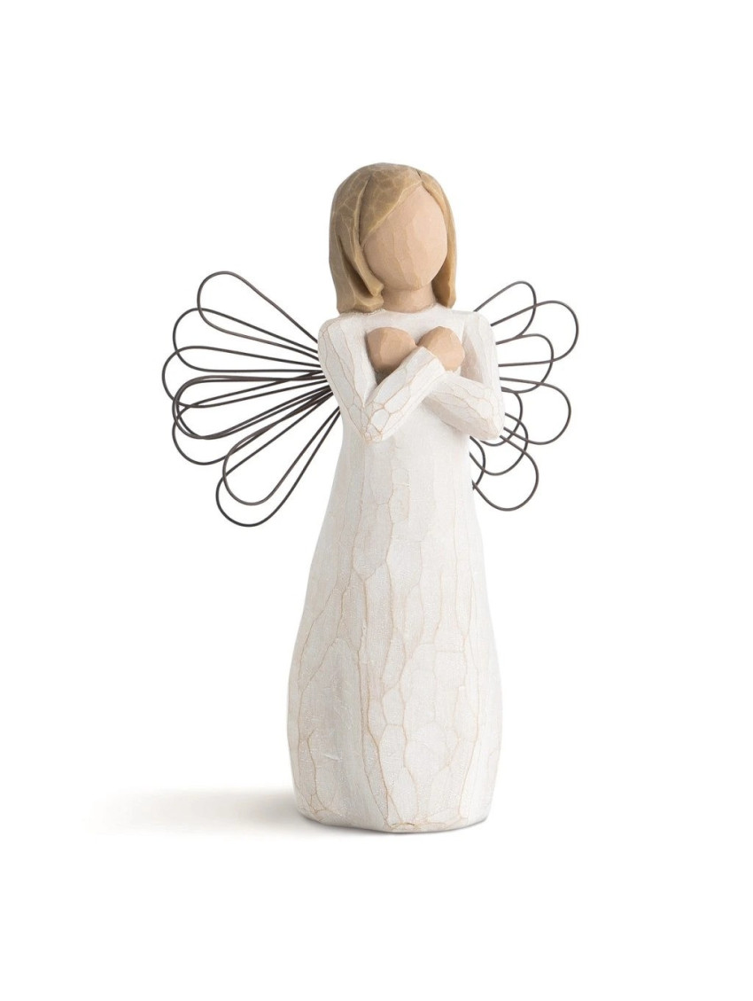 Figurka stojícího anděla v krémových šatech s drátkovými křídly a překříženými pažemi – „láska“