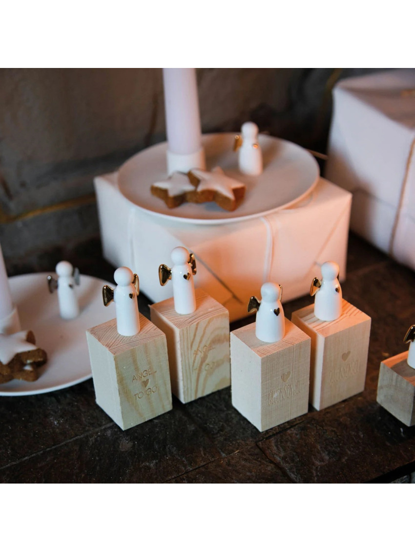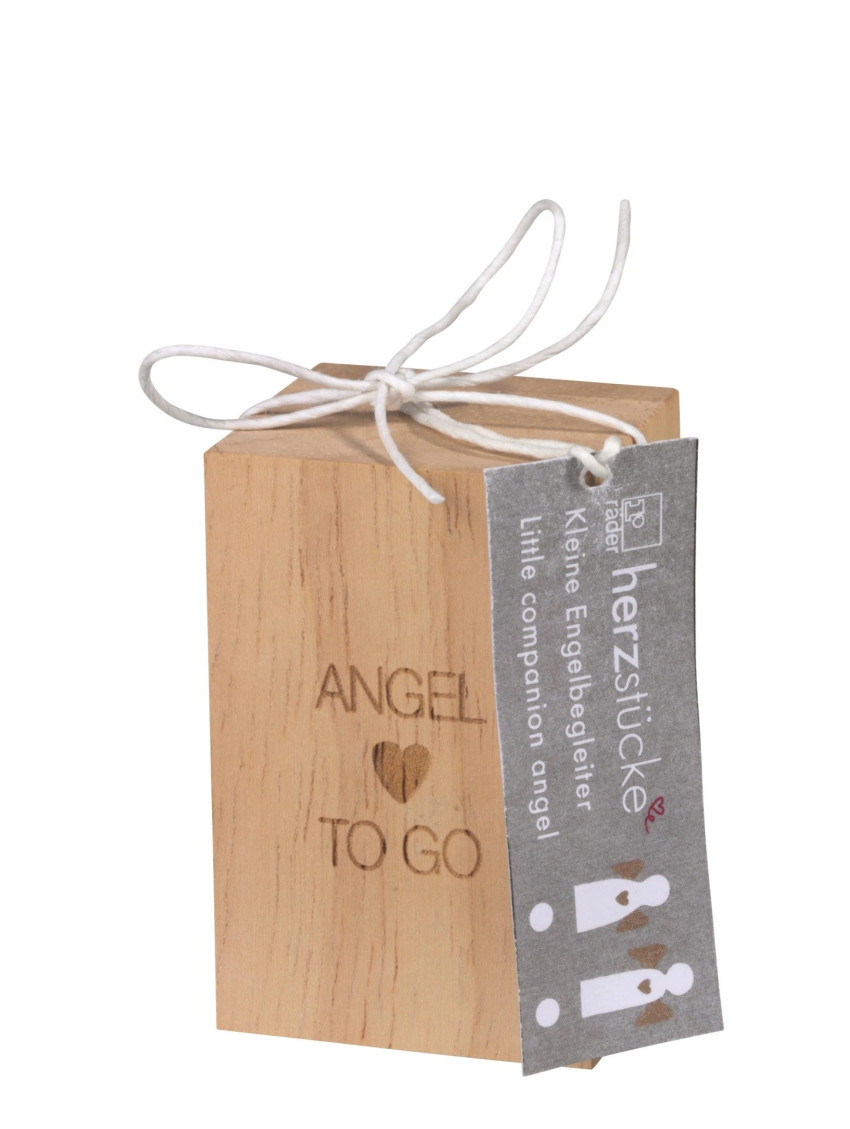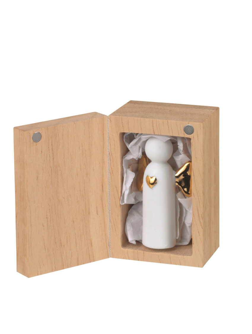Andílek je uložený v dřevěné krabičce s nápisem a je tak připravený být darován někomu blízkému.