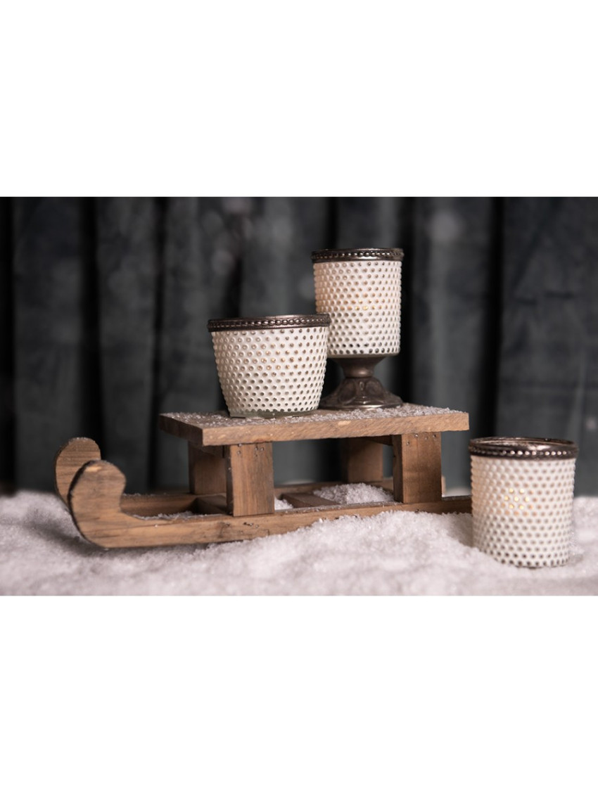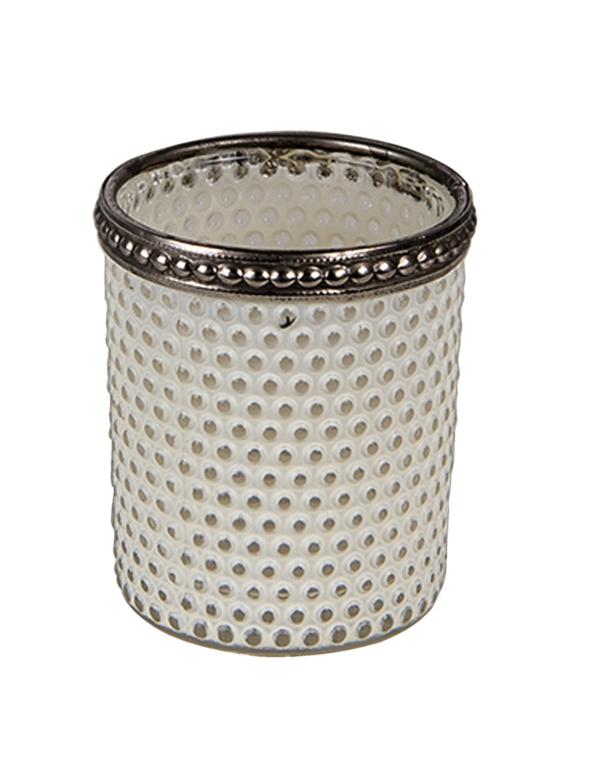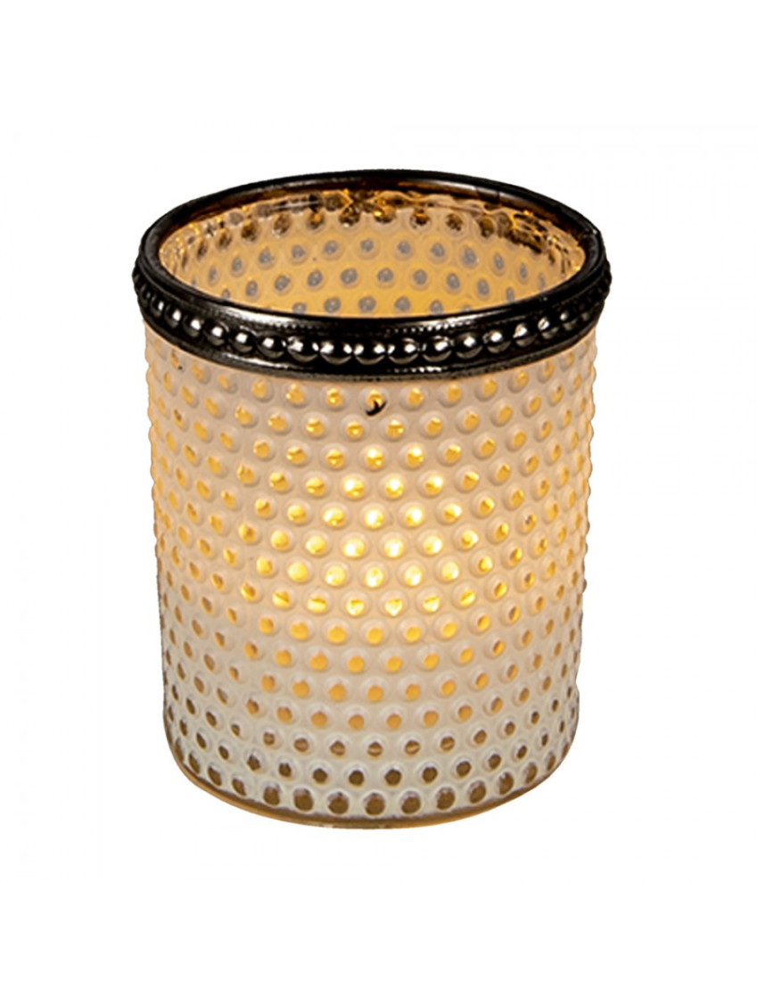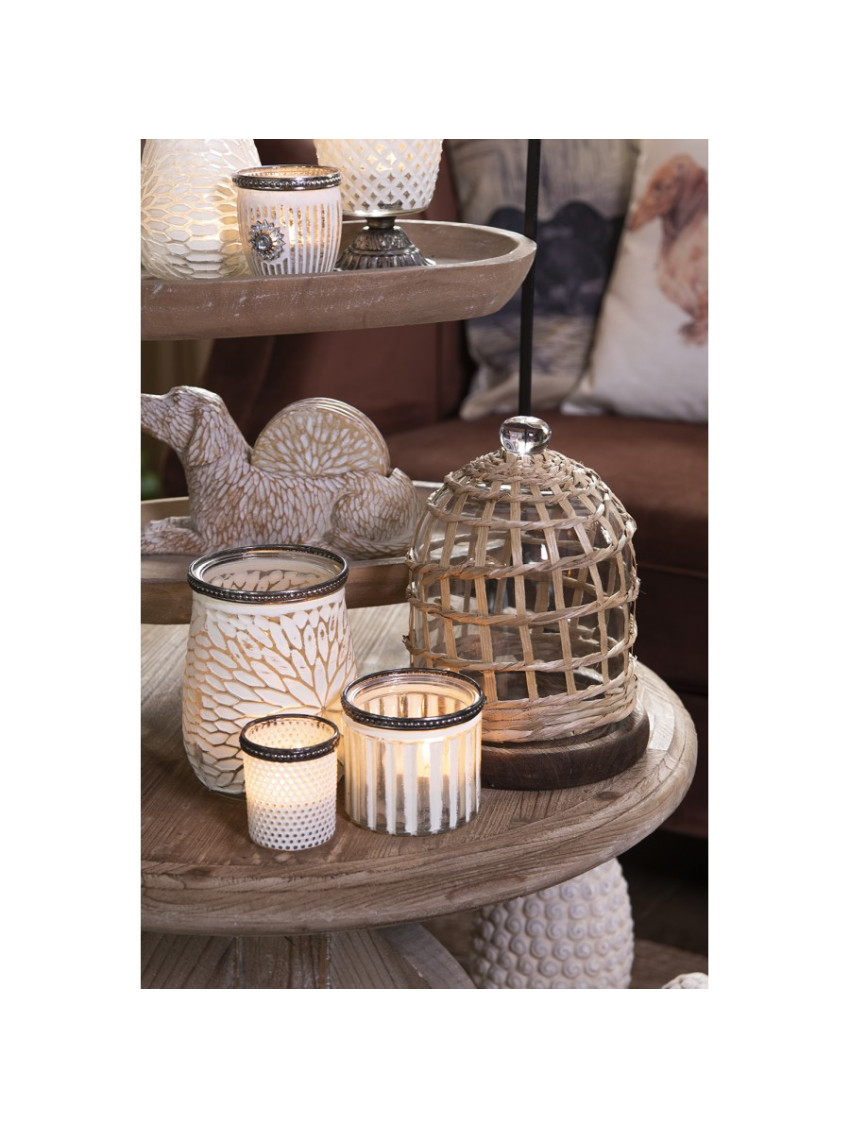 Skleněný svícen na čajovou nebo votivní svíčku s bílým dekorem bude vypadat skvěle na jídelním stole, komodě i ve výklenku okna. Pro ještě krásnější vzhled ho zkombinujte s podobnými skleněnými svícny různých velikostí.