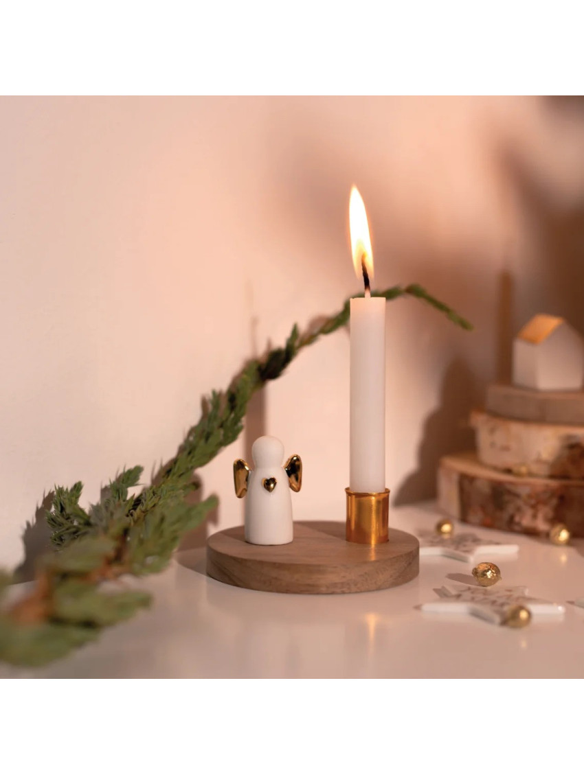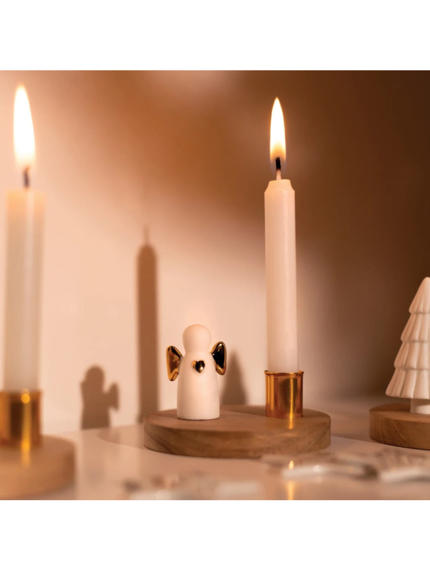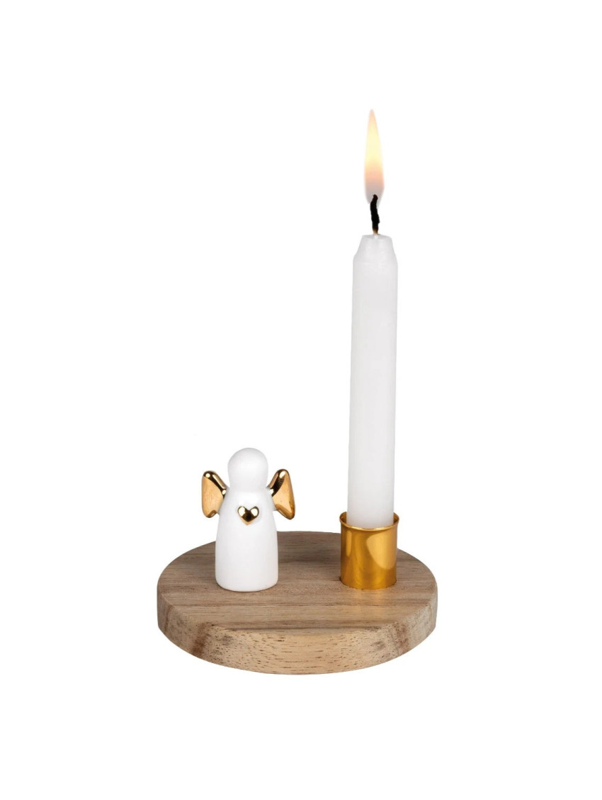 Svícen tvoří kulatý podstavec ze dřeva, dekorace v podobě porcelánového andílka se zlatými křídly a držák na svíčku ve zlaté barvě – ideální pro vytvoření útulného koutu během zimy i o Vánocích.