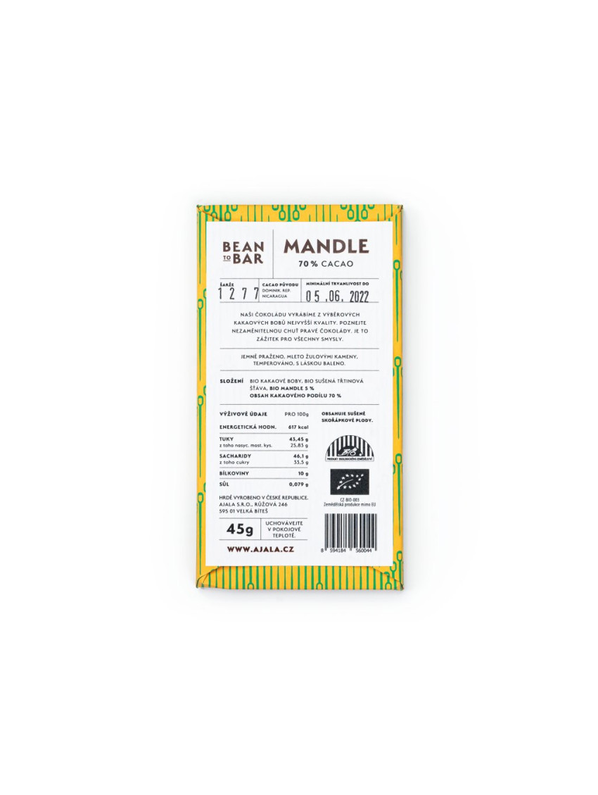 Složení: bio kakaové boby, bio sušená třtinová šťáva, bio mandle 18%