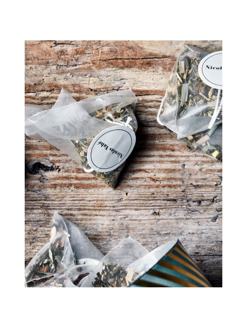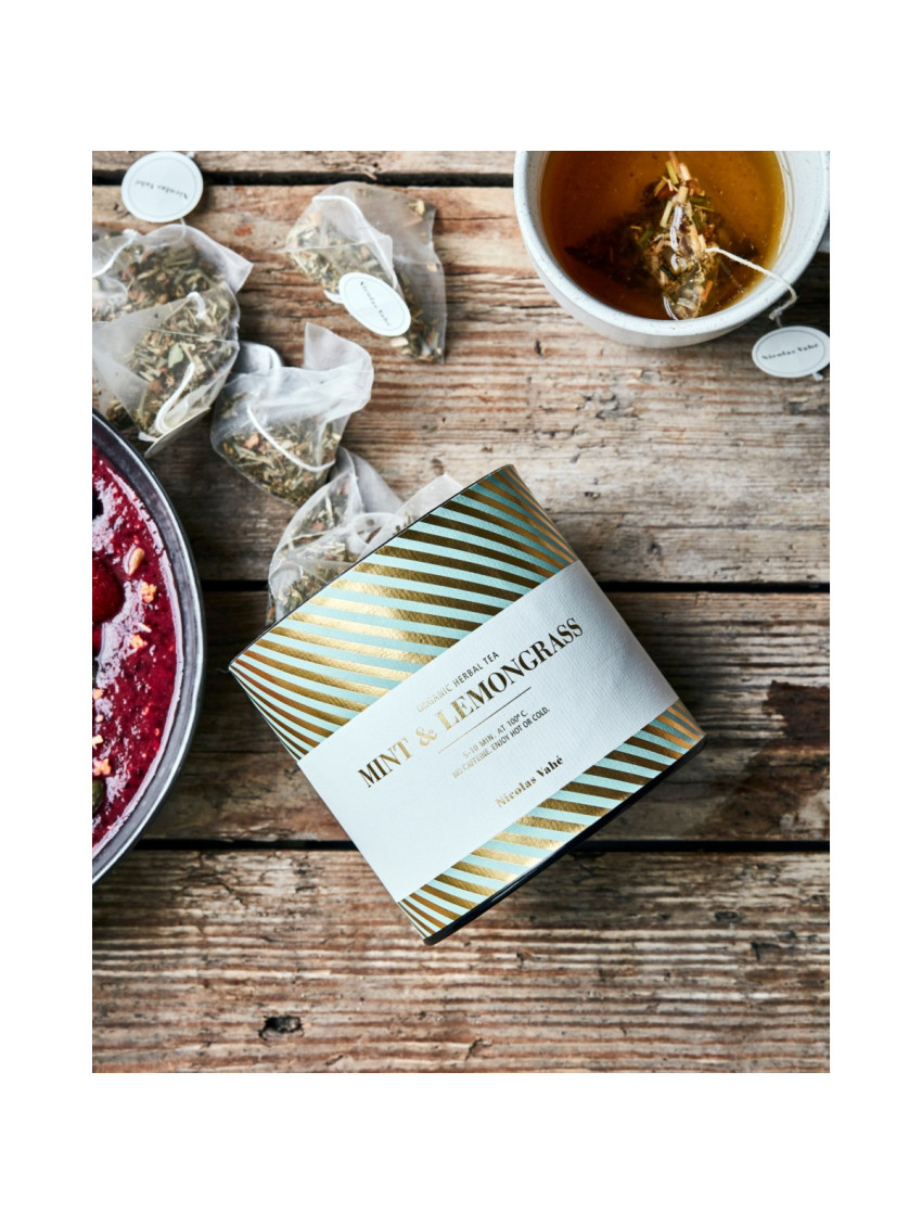 Složení: Bio bylinný čaj s mátou a citronovou trávou (citronová tráva* 28 %, kousky jablek*, máta peprná* 18 %, kořen lékořice*, květy heřmánku*, listy jahodníku*, fenykl*, květy lipového květu*, květy měsíčku lékařského*.