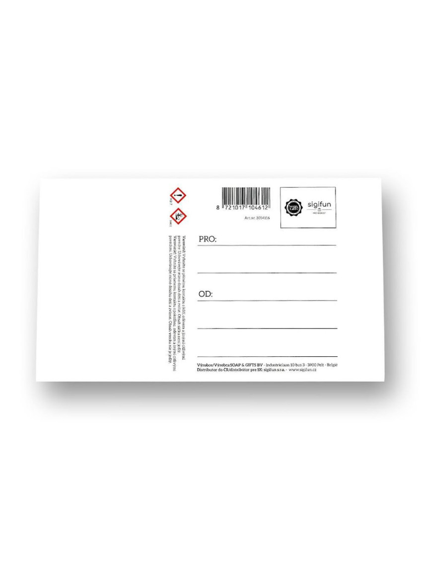 Krásné, elegantní voňavé přáníčko s vůní svěžího prádla je naplněno jemnými kamínky s vonnou esencí. Popřejte svým blízkým tímto nevšedním přáním. Rozměr: 15 x 10 cm. Belgická značka Soap&Gifts založená v roce 2015, která se specializuje na produkty vyráběné z mýdla. Veškerá výroba probíhá v Belgii za použití prvotřídních surovin.