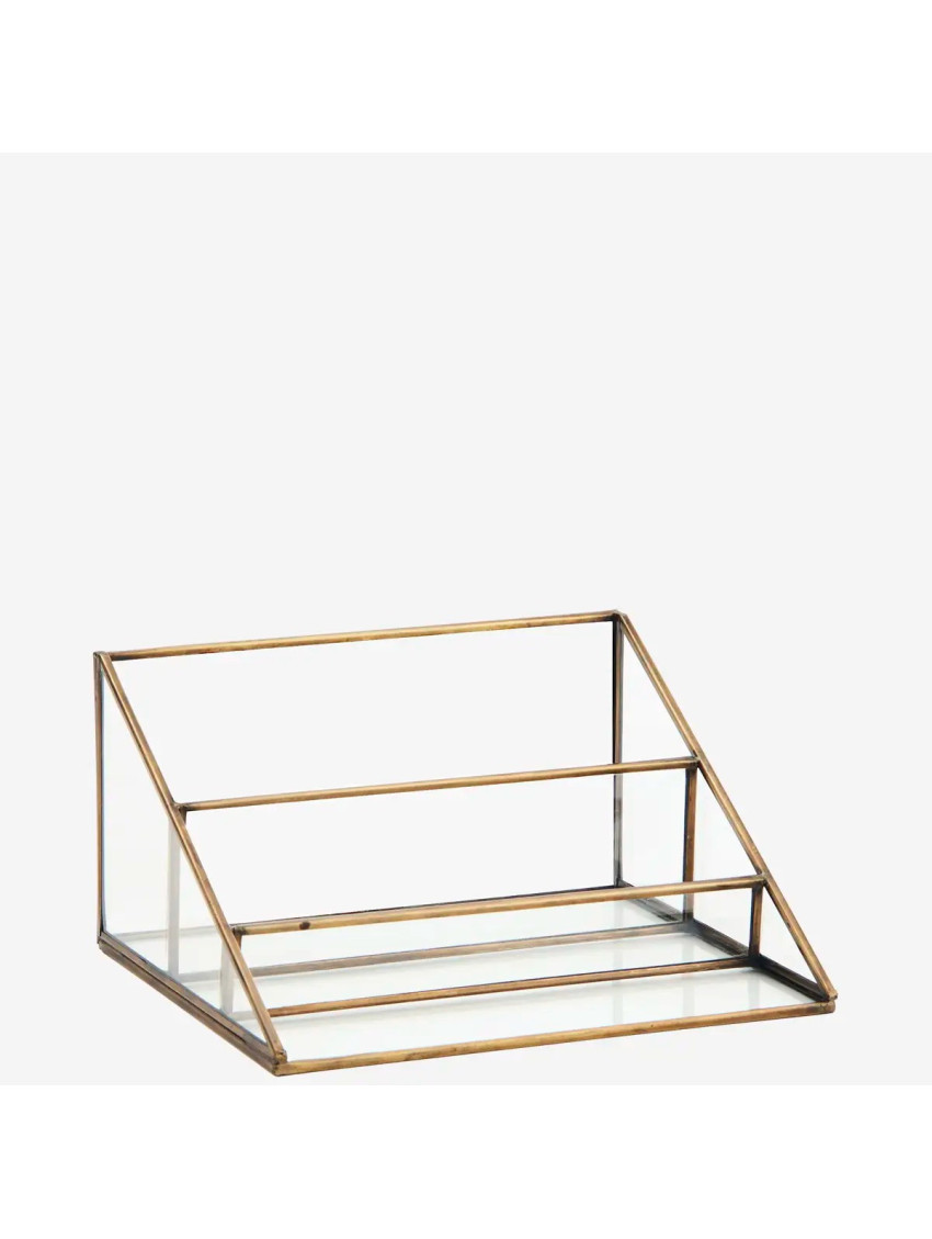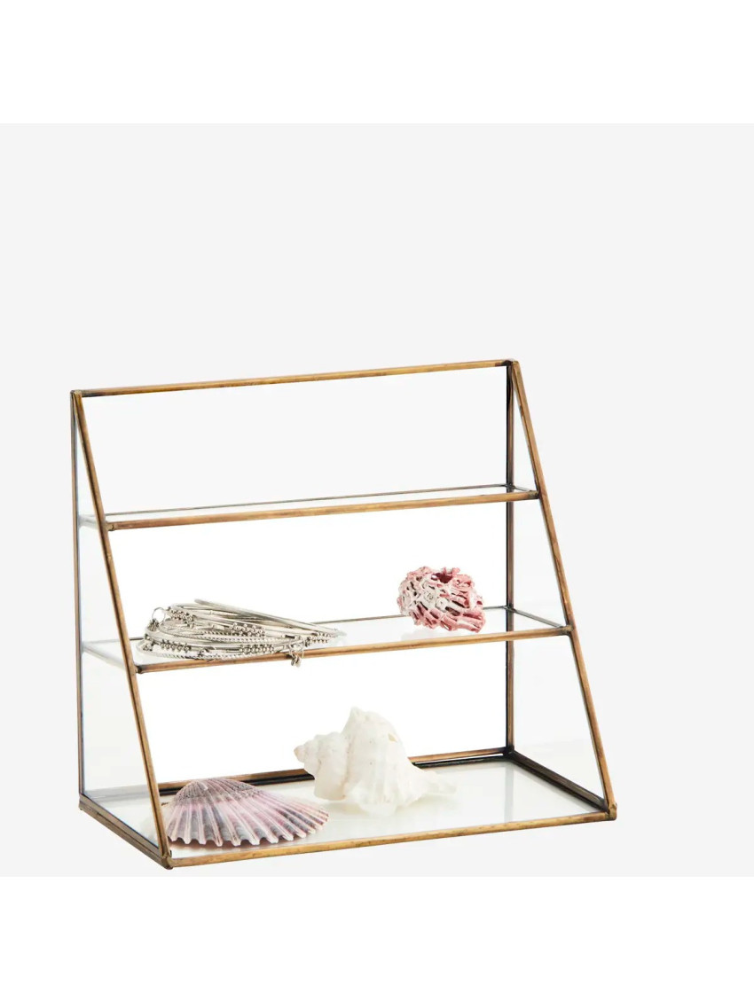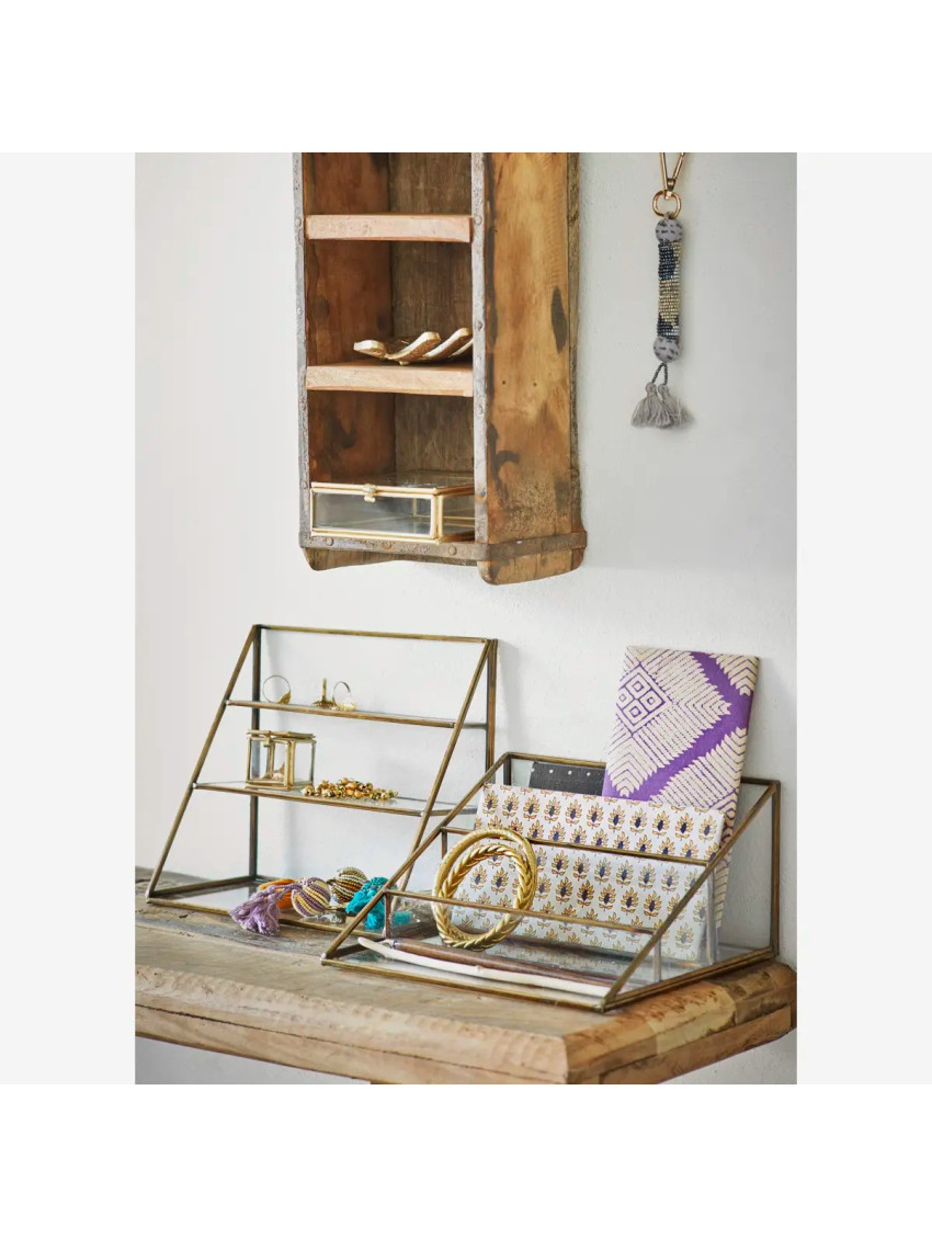 Organizér je v kovovém rámu zlaté barvy s patinou a se skleněnými stěnami. Slušet bude dámskému budoáru i stylovému psacímu stolu.