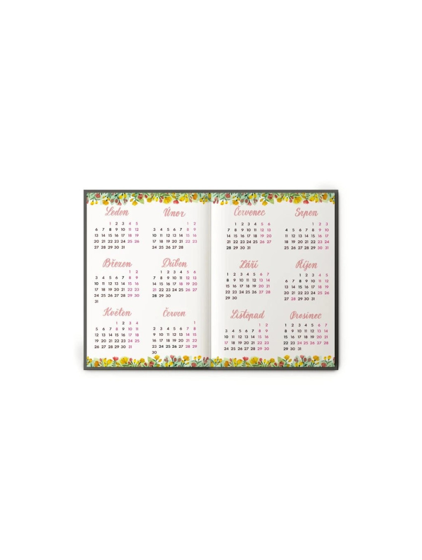 Můžete se opět těšit na autorské ilustrace, měsíční přehledy, roční přehled, jmeniny u každého dne a prostor na poznámky.