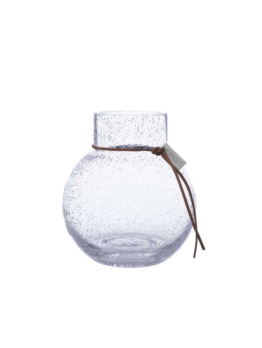 Oblíbená skleněná váza ERNST nyní přichází s nádhernou strukturou ve skle. Váza je čirá, avšak sklo je plné bublinek. Kytice v ní bude fantastickým dekorativním prvkem na Vašem stole.Vázy ERNST lze také použít jako lucerny na svíčku. Váza má kolem hrdla uvázanou koženou šňůrku s kovovým přívěškem. Z hrdla jde snadno sundat, avšak za nás dodává vázičce...