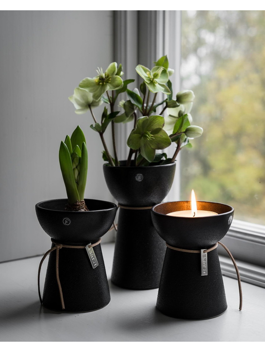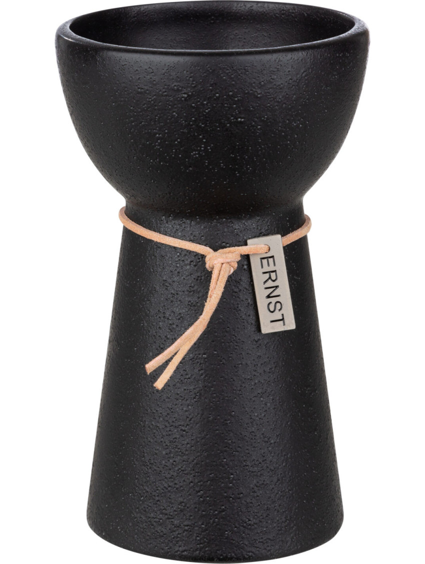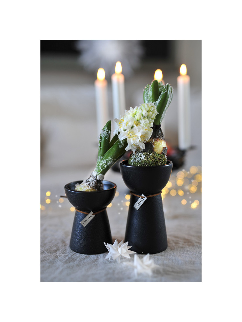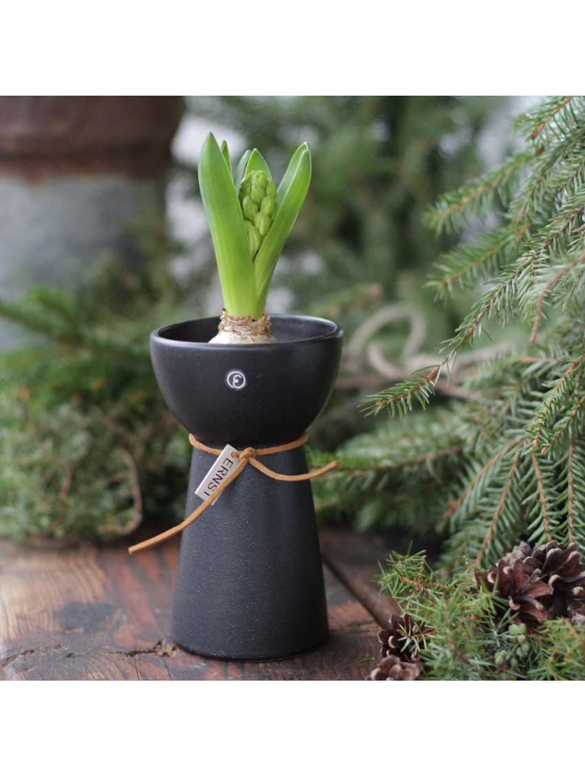 Hyacintové vázy švédské značky ERNST máme k dispozici v různých variantách. Tato je z černé, matné keramiky s uvázanou stužkou z kůže kolem hrdla. Pro všechny milovníky minimalismu.