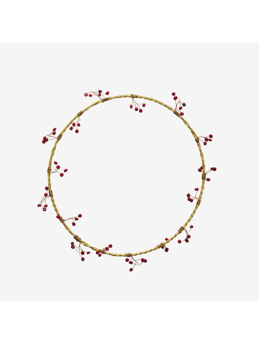 Tento úžasný věnec z dílny dánské značky Madam Stoltz je všestranným doplňkem každé slavnostní atmosféry. Byl vyroben s péčí v Indii a kombinuje železo, mosaz a dřevěné korálky, čímž vytváří harmonickou směs starožitné mosazi a červených tónů. Věnec je ručně vyroben s precizností a odráží podstatu tradičního řemeslného zpracování. Je ideální pro vánoční dekorace, ale lze jej pověsit na dveře na podzim a sundat na jaře ;). Můžete jej elegantně vystavit na stěnách nebo dveřích, čímž dodá kouzlo každému prostředí.