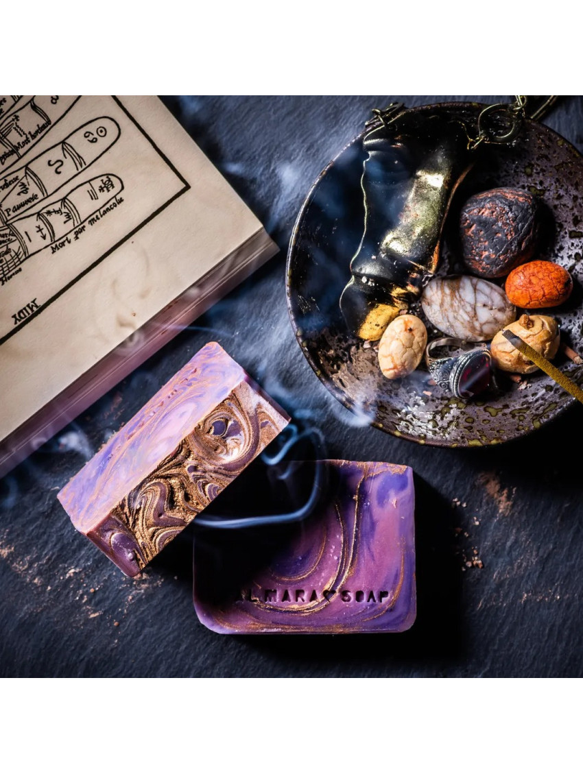 Je to jako když otevřete dveře, které tam předtím nebyly, a se zatajeným dechem vstupujete do tajemného, přesto důvěrně známého, bezpečného místa zahaleného vůní pomeranče s tóny pačuli, jasmínu, geránia a růžového a santalového dřeva. Magický je i samotný design mýdla v nachové, fialové a zlaté barvě, který naplno odhalí svou krásu pod proudem tekoucí vody.
