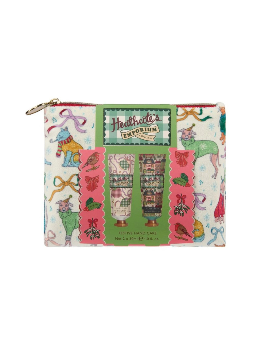 Dopřejte si sváteční péči o ruce s dárkovou sadou Heathcote’s Emporium, která obsahuje jemný mycí gel a sametově hebký krém na ruce v praktické taštičce se zipem. Taštička je zdobena hravými ilustracemi a nese vánoční atmosféru inspirovanou nostalgickými tradicemi. Oba produkty provoní pokožku uklidňující vůní eukalyptu, levandule a pačuli, doplněnou o svěží tóny zelených listů, konvalinky a hřejivého santalového dřeva.