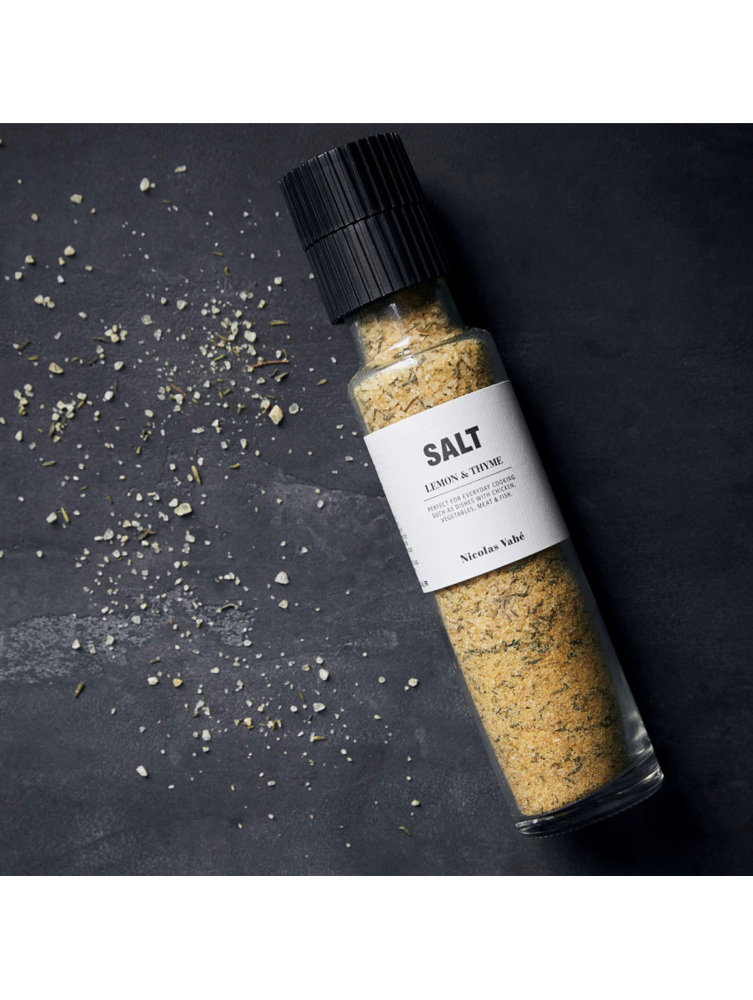 Mlýnek s mořskou solí s tymiánem, citrónu a špetkou kurkumy z rukou dánského šéfkuchaře Nicolase Vahé se ideálně hodí na červené maso, ryby, mořské plody nebo těstoviny.