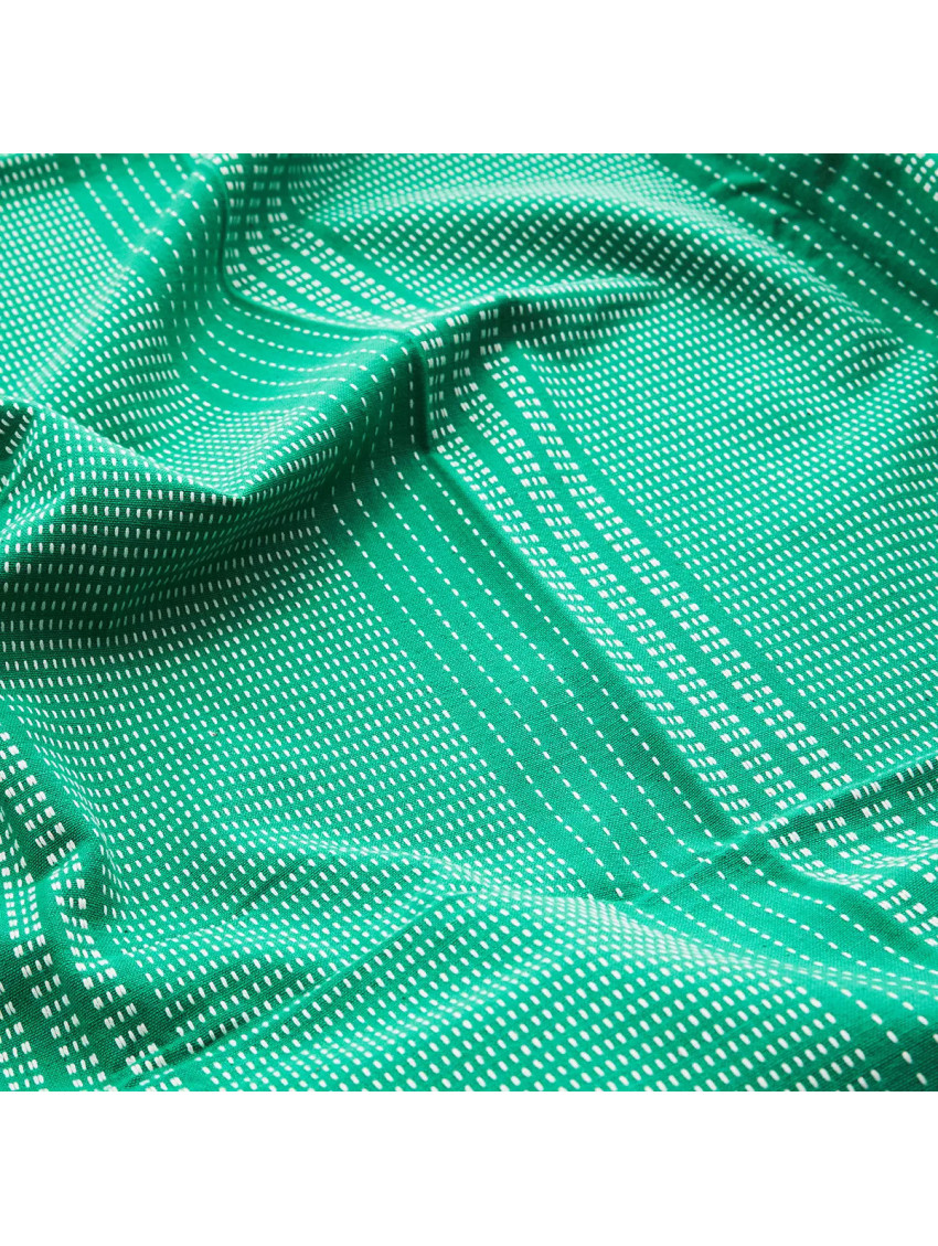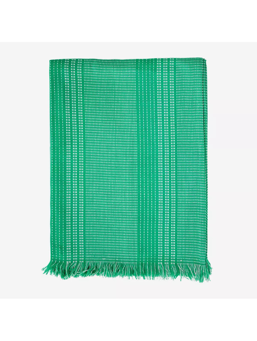 Bavlněný ručník má svěže zelenou barvu a zdobí jej třásně po okrajích.