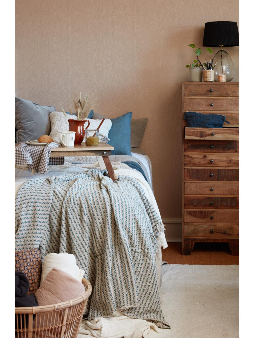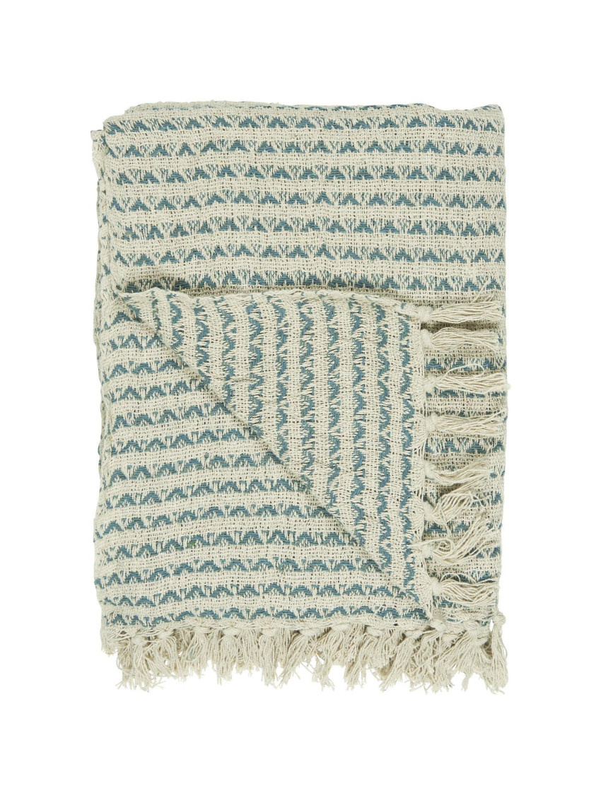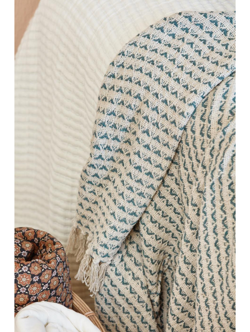 Bavlněný pléd v krémové barvě s petrolejovým akcentem se skvěle hodí jako přehoz přes postel či sedačku. Stejně tak dobře však poslouží jako pikniková deka, nebo pléd na terasu při letním posezení.
