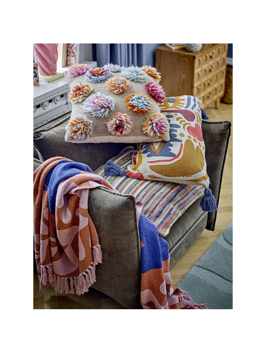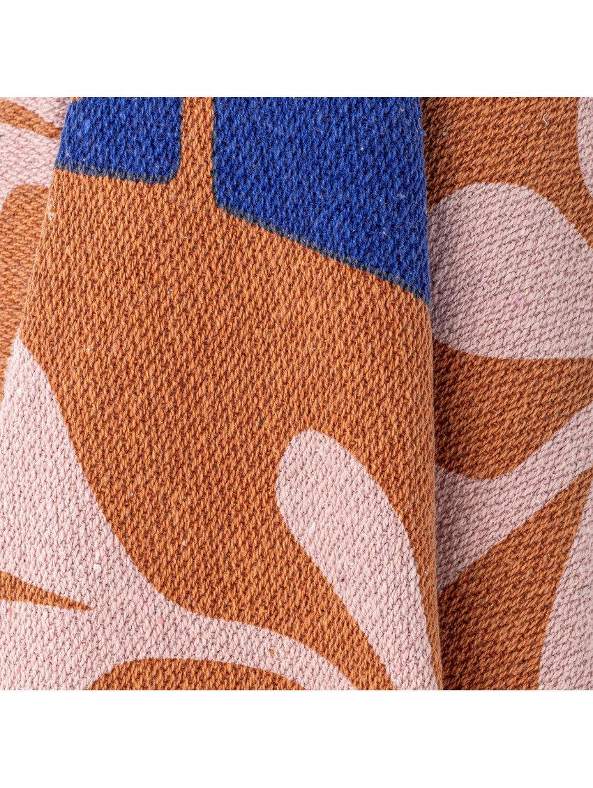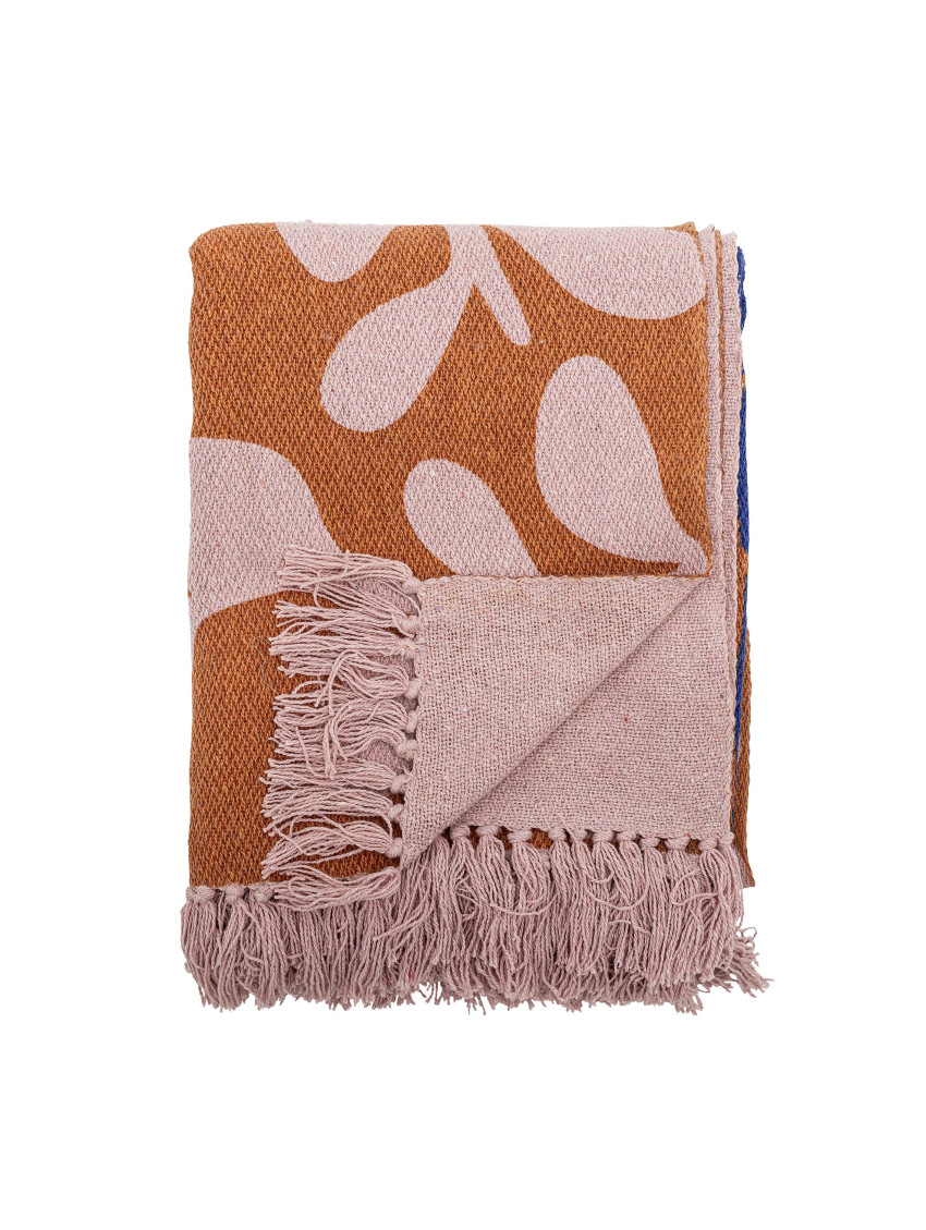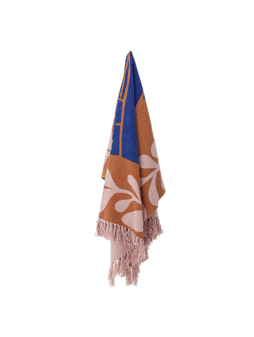 Pléd z recyklované bavlny ATLE od dánské značky Bloomingville v okrové a růžové barvě s modrým obrazcem uprostřed se skvěle hodí jako přehoz přes postel či sedačku. Stejně tak dobře však poslouží jako pikniková deka, nebo pléd na terasu při posezení.