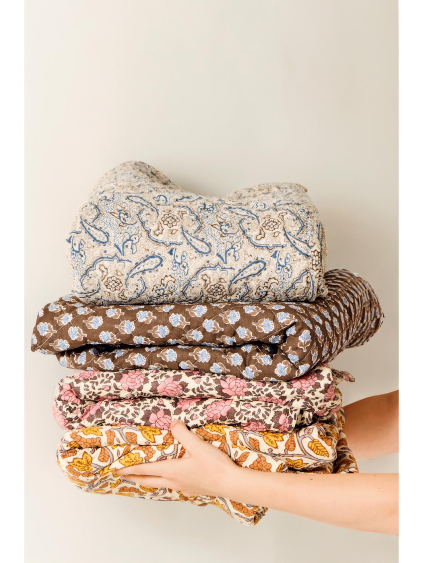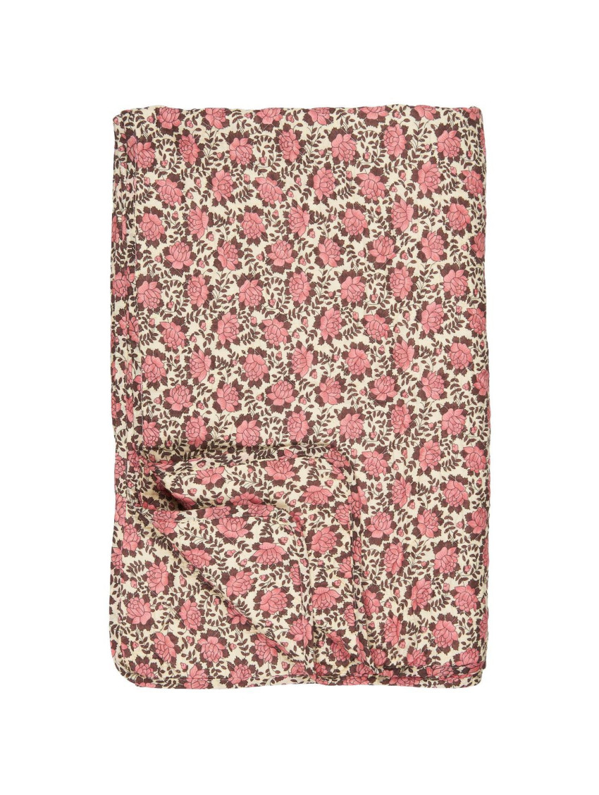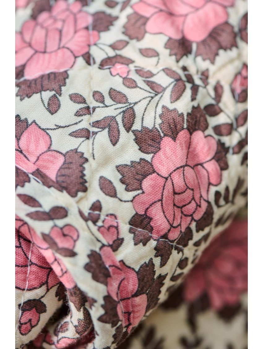 Bavlněný prošívaný přehoz s oboustranným motivem s dekorem růžovo-hnědých kvítků bude elegantním doplňkem ložnice, nebo vás příjemně zahřeje při sledování televize či čtení knížky. Určitě využijete i při venkovním posezení. A krásně se hodí i do dětských pokojíčků.