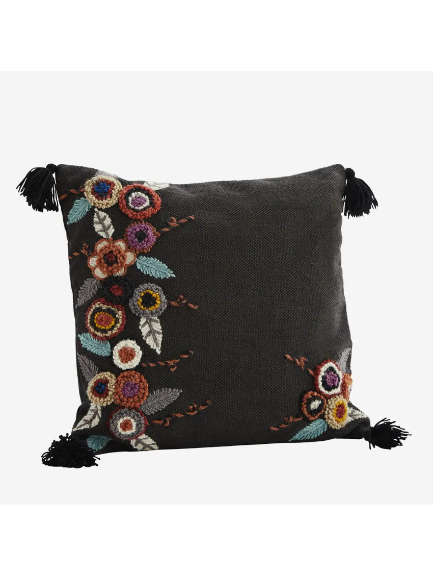 Bavlněný povlak v černé barvě zdobí vyšívané květy rozmanitých barev, díky nimž zapadne do romantických i moderních interiérů. Skvěle bude vypadat na gauči i posteli.