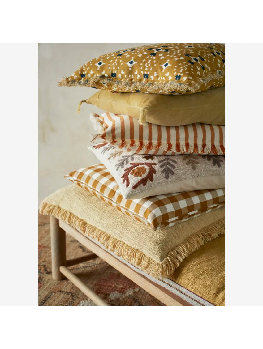 Ručně šitý povlak na polštářek dánské značky Madam Stoltz v jemné pískové barvě bude okatým doplňkem vašeho gauče. Střapce i výšivka ladí interiér do oblíbeného boho stylu. Rozměry: 60 x 40 cm bez výplně. Doporučené čištění v ruce.