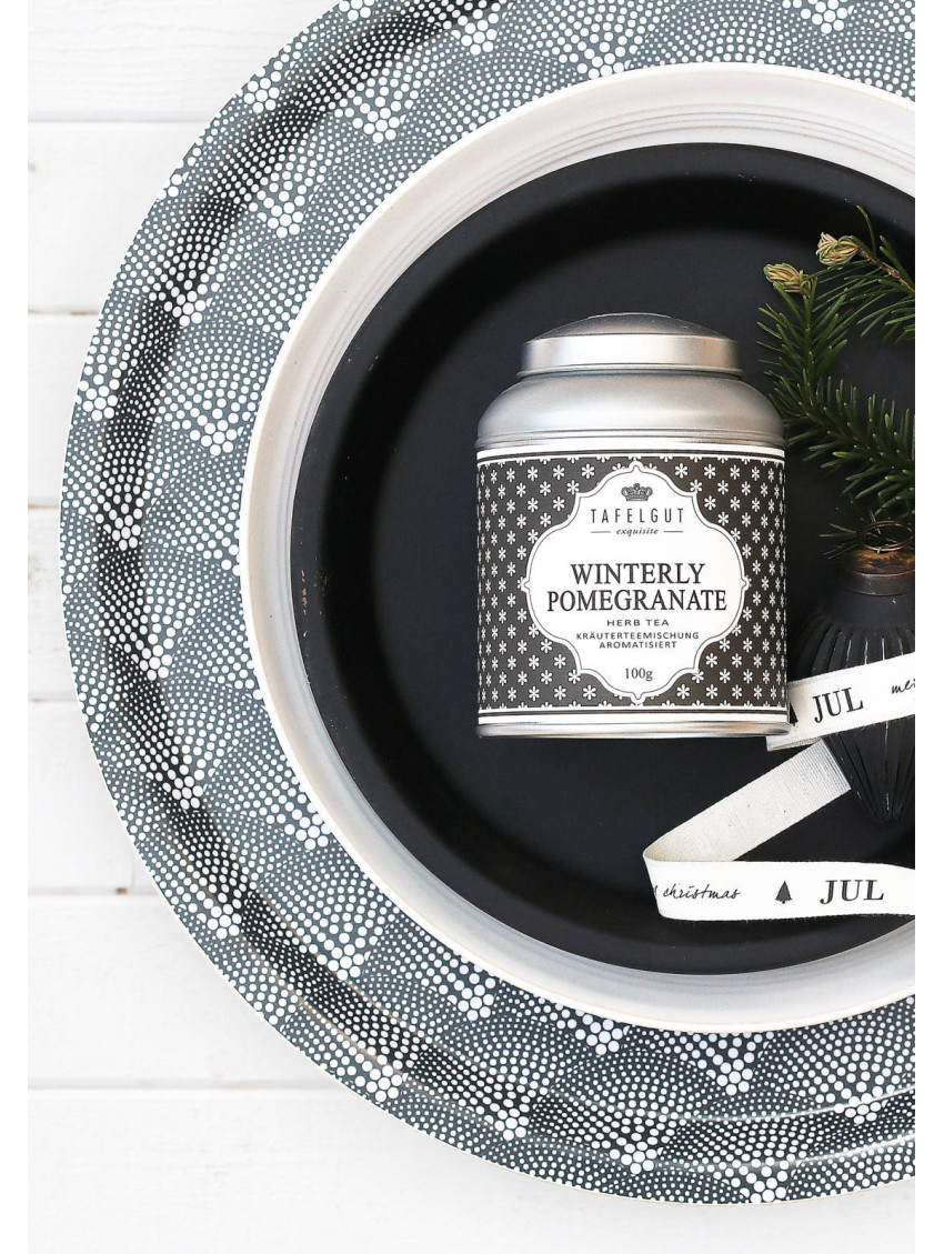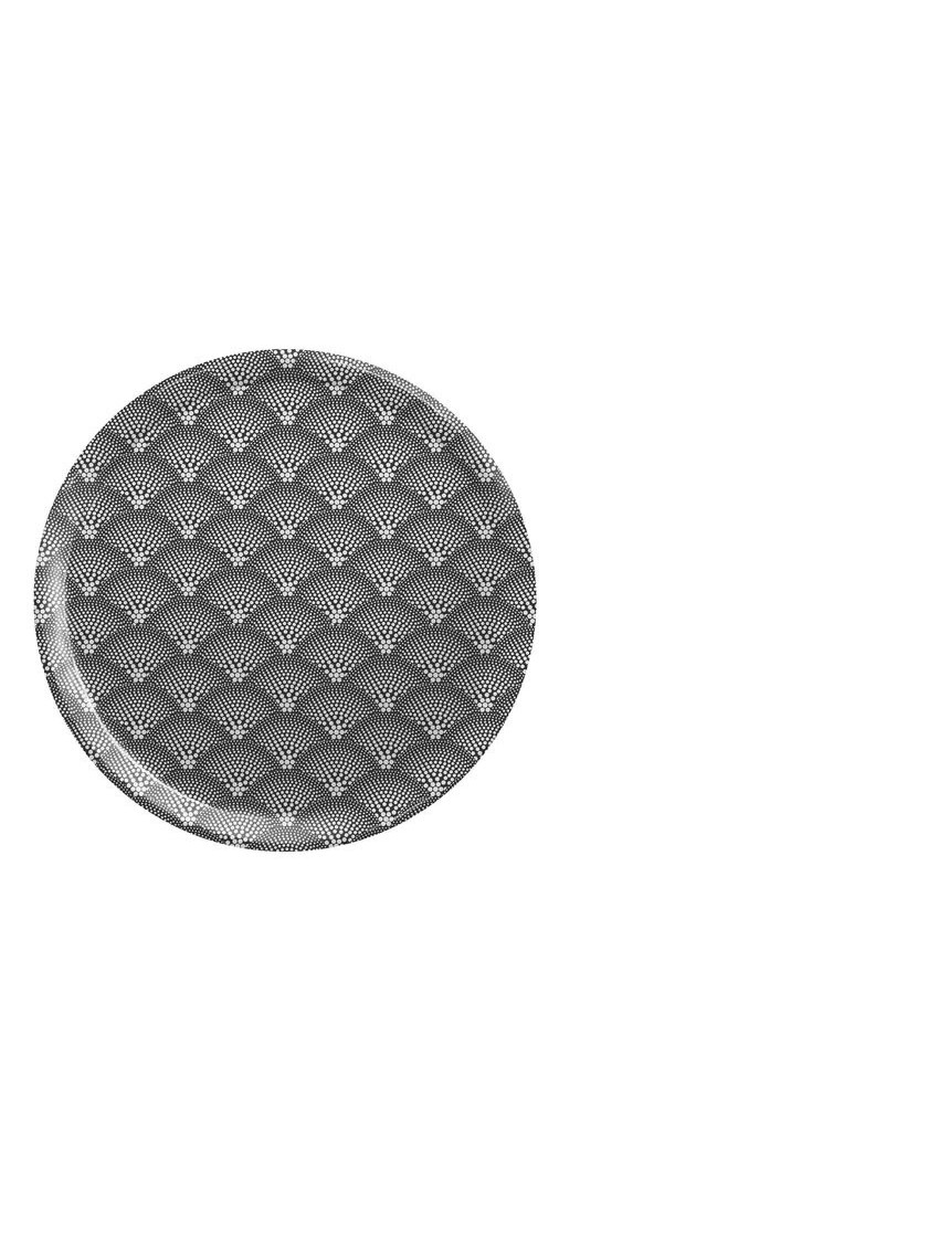 Designový černý kulatý tác s bílým dekorem působí velmi exkluzivně a originálně.