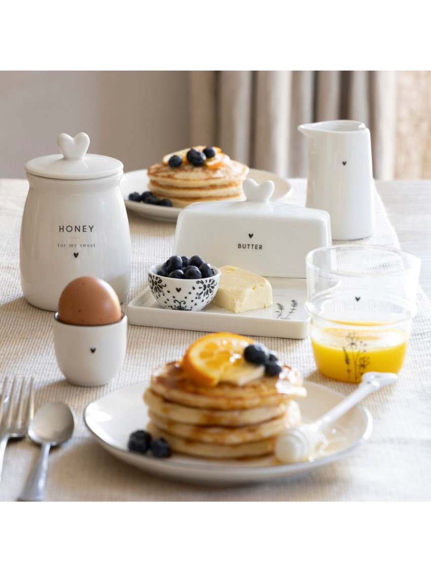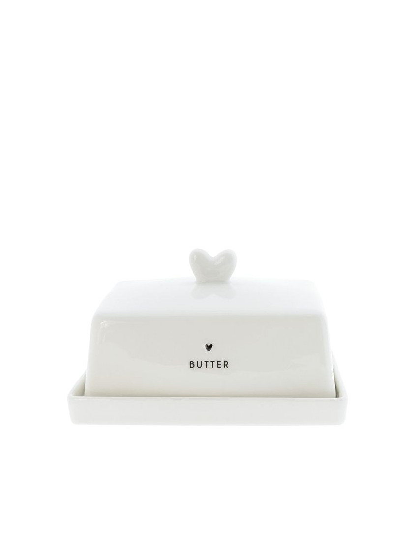 Odolná keramika v bílé barvě s černým nápisem BUTTER (máslo) a srdíčkem. Tácek má jemný černý kvítek a uprostřed také srdíčko.