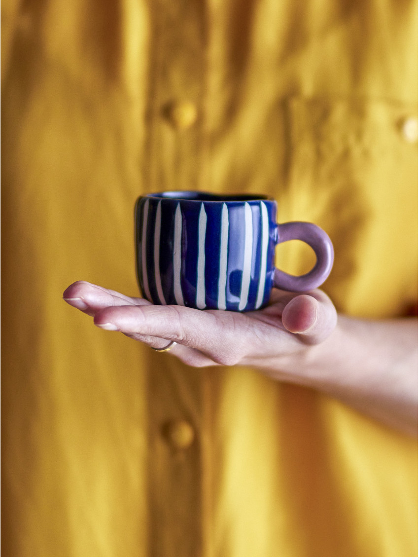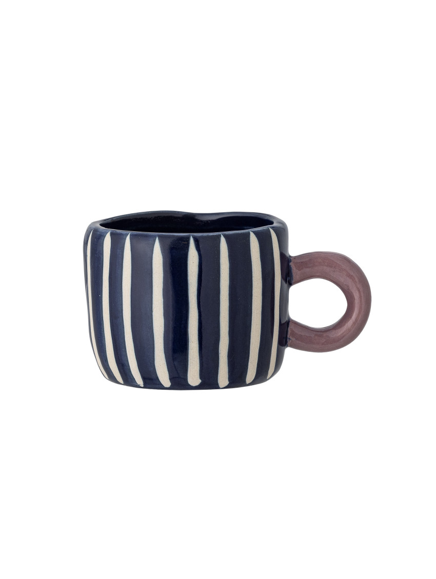 Okouzlující hrníček Nini dánské značky Bloomingville je vyroben z kameniny a má roztomilý, ručně malovaný vzor. Šálek je zdoben jemnými modrobílými proužky, s uchem v sytě růžové barvě. Díky svému jedinečnému designu je ideální pro kombinování s jinými šálky pro vytvoření zábavné a dekorativní kolekce. Ručně malované detaily dělají každý šálek jedinečným.
