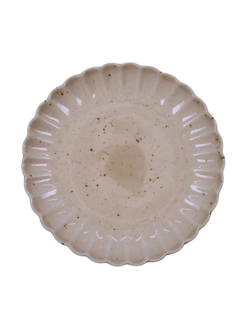 Krásný dezertní talíř dánské značky Ib Laurse má krémovou glazuru s flíčky a nepravidelné okraje. Skvělé na něm budou dezerty, obložené chleby, ovocné svačiny, lívance apod. Každý kus je díky ruční práci originál. Je vhodný do myčky nádobí a do mikrovlnné trouby. Průměr: 22 cm, výška: 2,6 cm.