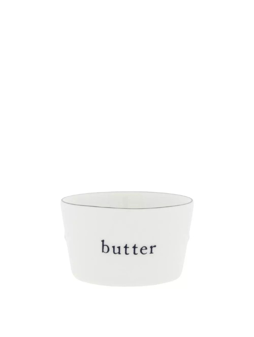 Krásná mistička s nápisem butter, která se bude skvěle hodit ke každodennímu použití. Na oříšky, olivy, na ovoce, dip a v létě na zmrzlinu... Nebo přesně na to, co je na ní napsáno - tedy třeba bylinkové máslo k masu, nebo šlehané máslo na krajíček kváskového chleba. Báječně poslouží při servírování tapas.