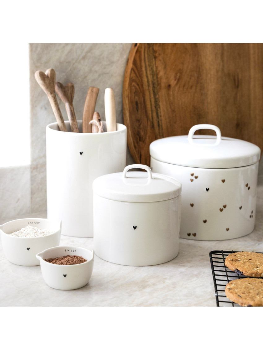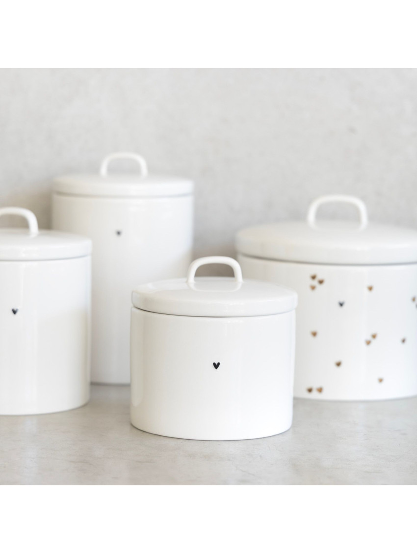 Bílá keramická dóza na pochutiny s víkem a černým plastickým srdíčkem.
