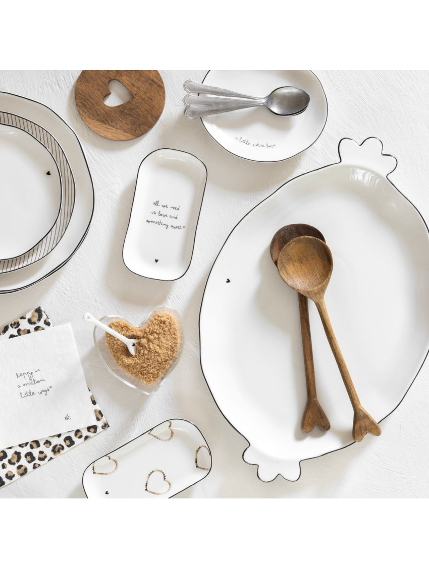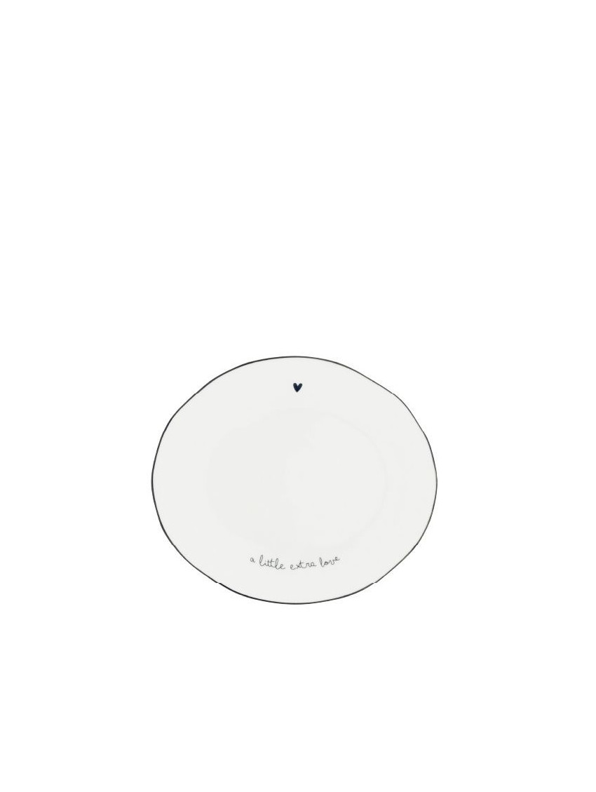 Mít v kuchyni po ruce menší talířek na servírování příloh a menších pochutin je nutností. Jak se Vám líbí tento oválný s černým srdíčkem a nápisem A little extra love?