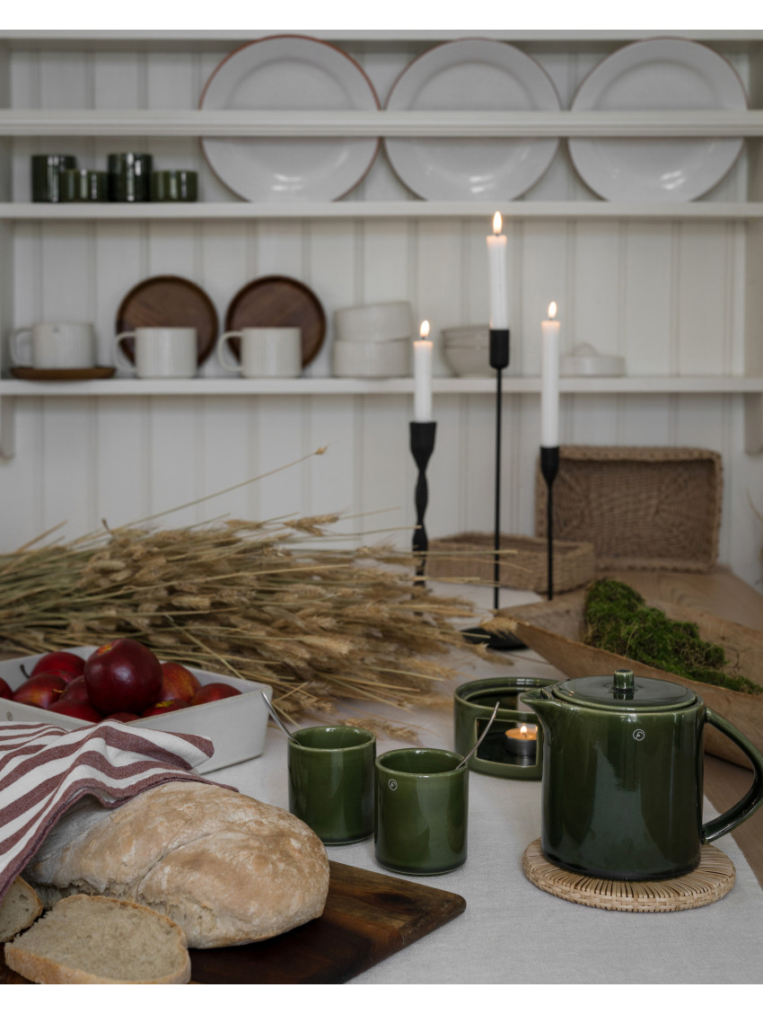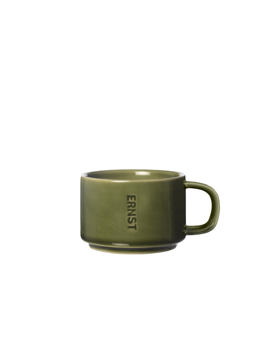 Vytvořte si útulnou chvilku a podávejte espresso nebo svařené víno v tomto zeleném keramickém hrnku švédské značky ERNST.