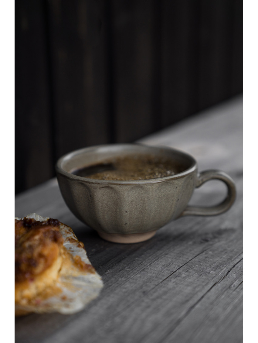 Rustikální vroubkovaný hrnek na kávu s nadčasovým nádechem. Ideální pro první šálek dne nebo na odpolední přestávku.