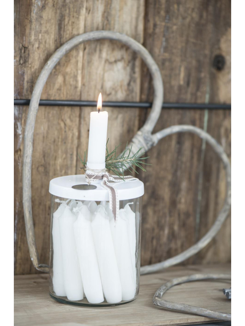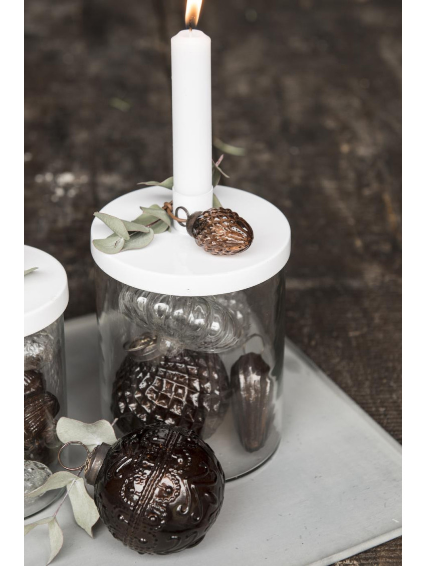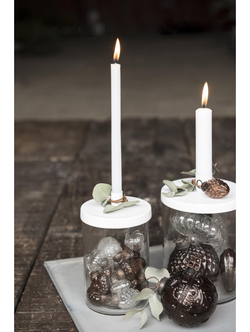 Skleněný válec, který má uvnitř připevněn stojánek na dlouhou svíčku. Kolem svíčky můžete dle fantazie naaranžovat věci, které máte rádi. V zimně snítku eukalyptu, chvojí, šištičky, vánoční baňky. Naopak v létě třeba písek, mušličky a kamínky. Okouzlí Vás však i prázdný jen se svíčkou. Výška 15 cm, průměr 11,5 cm