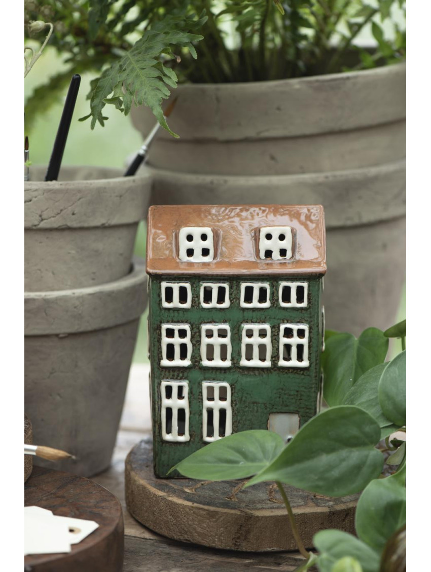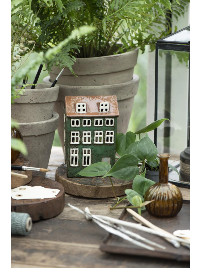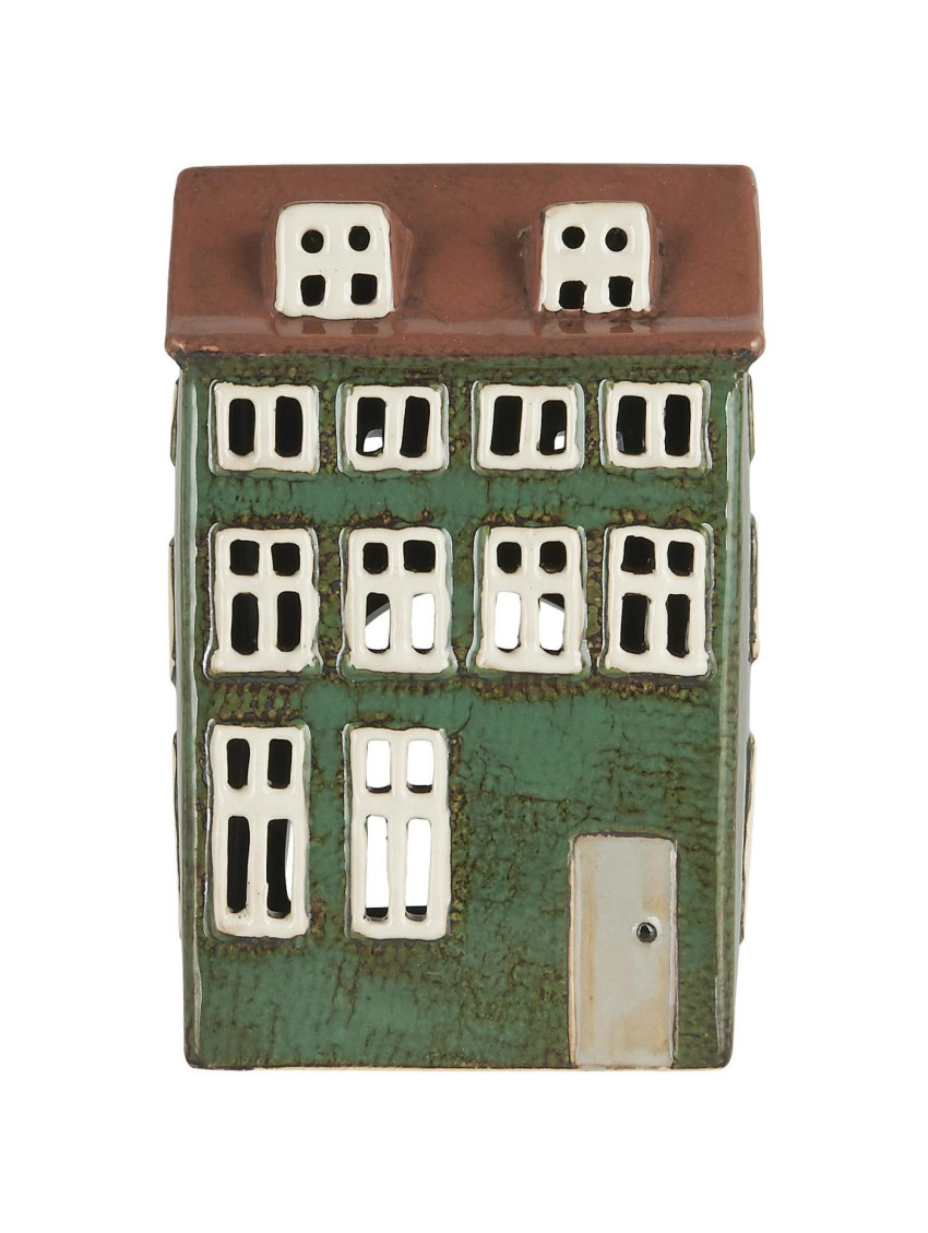 Keramický svícen od dánské značky Ib Laursen je glazovaný na zelenou barvu a je určený pro čajovou svíčku, která se vkládá ze zadní strany domečku.