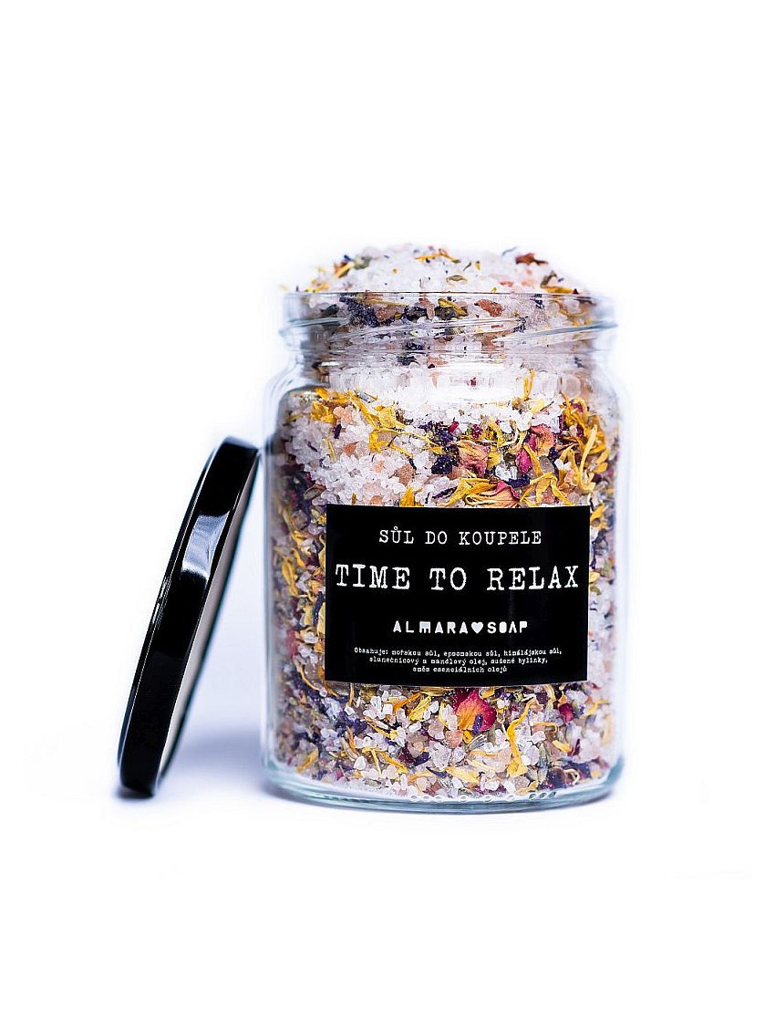 TIME TO RELAX je určená hlavně pro uvolnění těla a zklidnění mysli po náročném dni. Obsahuje na minerály bohatou epsomskou sůl, která je proslulá svými zklidňujícími účinky, působením proti stresu a bolesti kloubů a svalů. Dále obsahuje mořskou sůl, hrubou himálajskou sůl a směs bylinek – slézu, měsíčku, levandule a růže, které vodu přírodně obarví do modra. Směs bylinek je jemně namletá, takže se nemusíte bát ucpání odpadu.