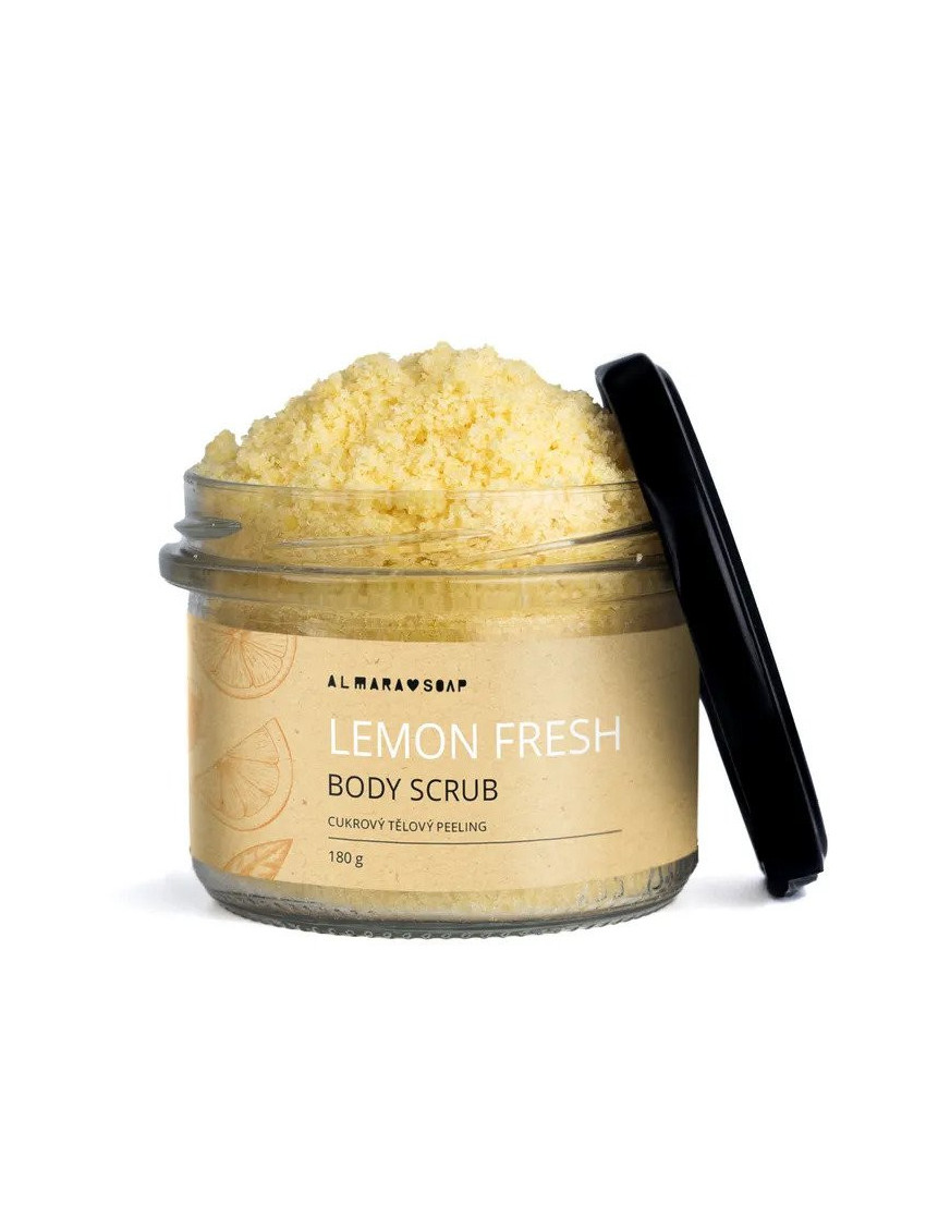 Cukrový scrub na tělo z letní limitované edice má krásnou svěží vůni citronu a skvěle se tak hodí k našemu mýdlu Limonáda.