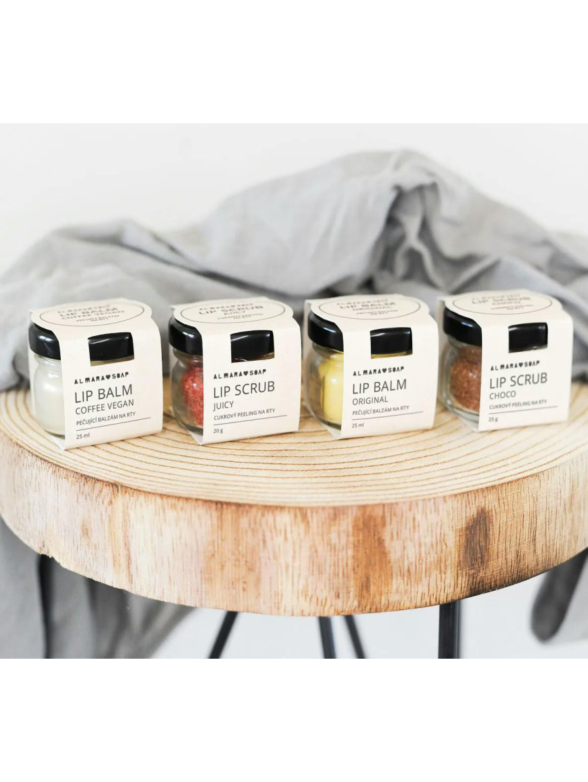Cukrový scrub na rty je určený pro jemnou pokožku rtů, která potřebuje vyživit, zvláčnit, nebo jen tak rozmazlit. Najdete v něm hnědý třtinový cukr, který jemně odstraní odumřelé kožní buňky a rty prokrví, mandlový olej lisovaný za studena, kakaové a bio bambucké máslo a kakao v bio kvalitě. Právě olej a másla dodají rtům potřebnou hebkost a vláčnost.