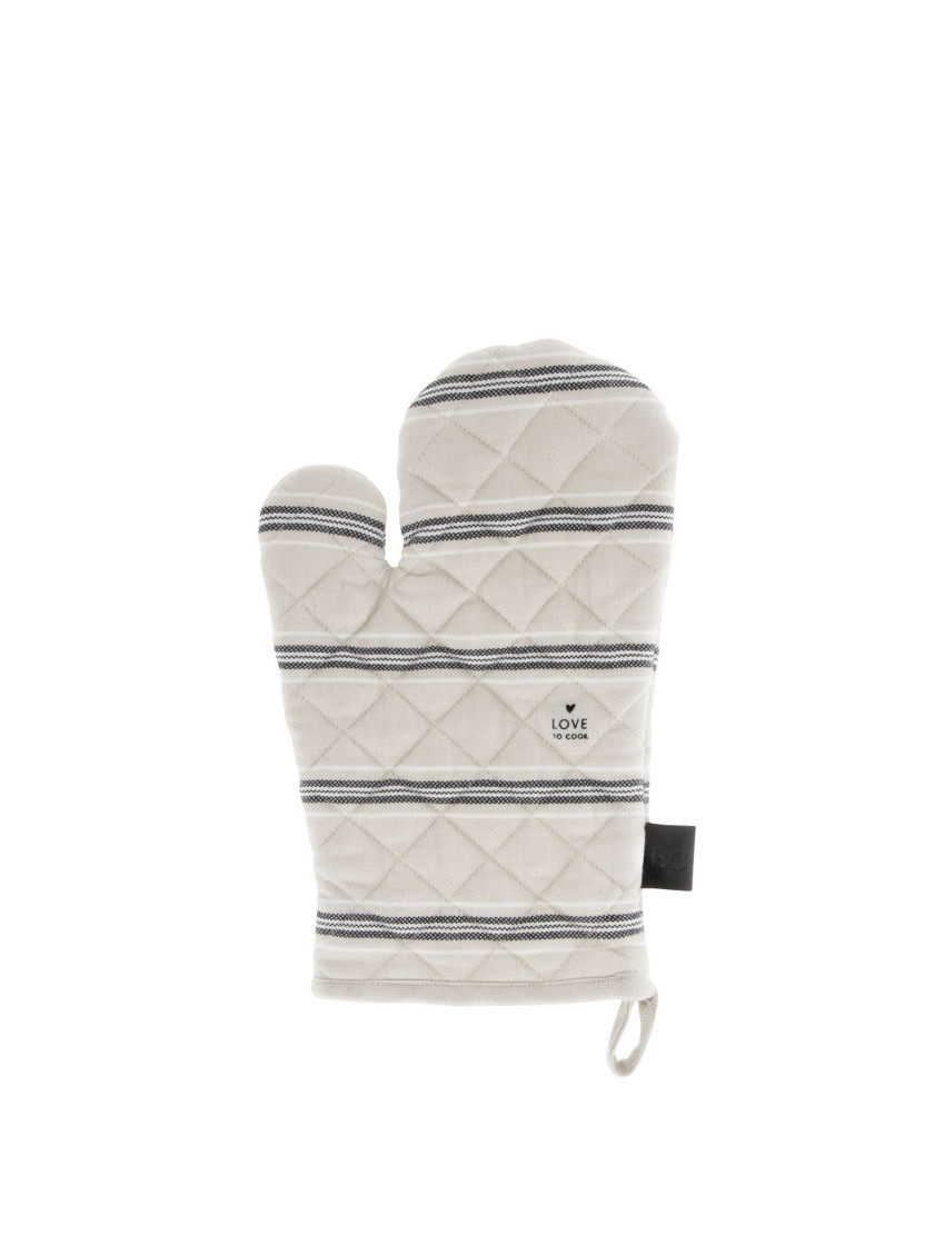 Půvabná chňapka holandské značky Bastion Collections s něžným dekorem pruhů na béžovém podkladě je s praktickým poutkem pro snadné zavěšení.