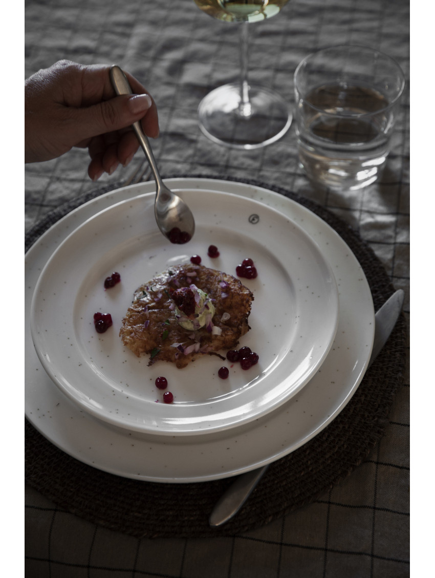 Porcelánový velký talíř ERNST je součástí větší série s několika různými díly, jako je dezertní talíř, hluboký talíř a všechny díly pro příjemné posezení u kávy. Krásná bílá glazura s náznaky malých teček dělá jídelní zážitek velmi příjemným.