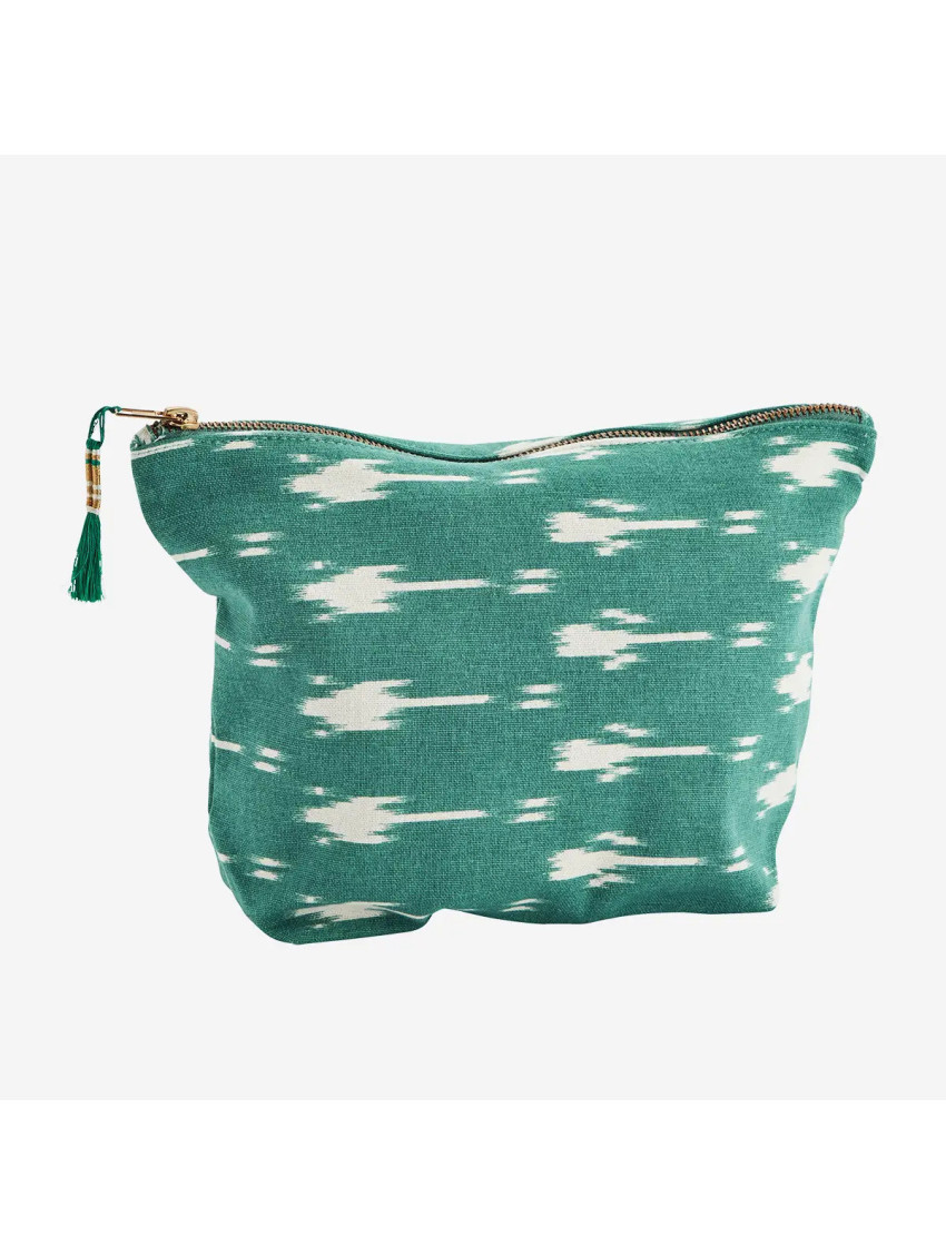 Taštička je v modrozelené barvě moře. Zavírání je na praktický zip zdobený střapečkem. Snadno pojme pečující kosmetiku na prodloužený víkend, perfektní bude do kabelky i jako dekorace na poličku do koupelny nebo na kosmetický stolek.