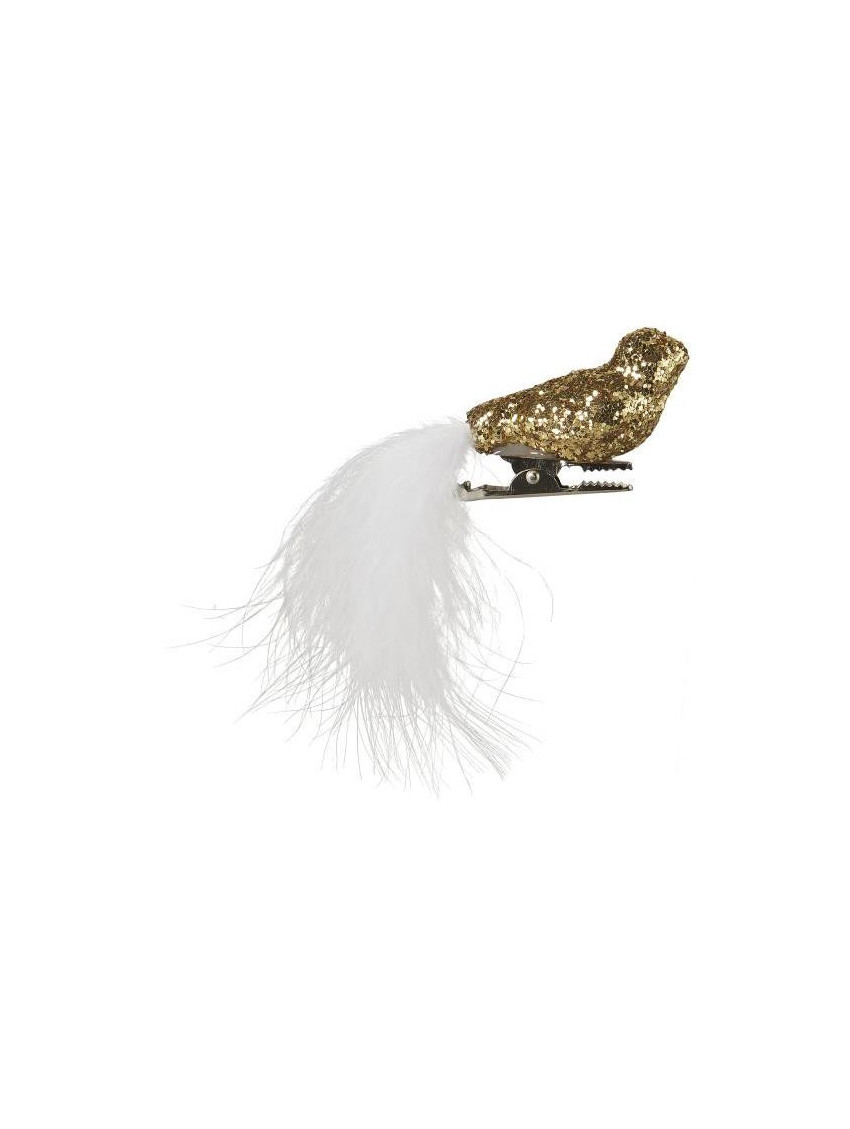Ptáček je lesklý zlatý a ocásek má z bílých pírek. Je připevněn na malém skřipci, díky kterému ho snadno zavěsíte na stromeček, větvičku nebo třeba do okna na záclonku.