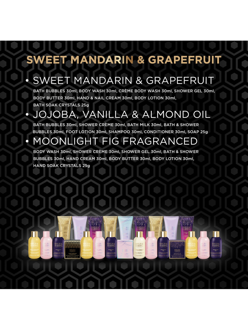 Obsahuje 24 ikonických produktů včetně bublinek do koupele, mýdla na tělo, krému na tělo, sprchového krému, sprchového gelu, koupelového mléka, bublinek do koupele a sprchy, krému na ruce, tělového másla, krému na ruce a nehty, mléka na nohy, tělového mléka, šamponu, kondicionéru, Mýdlo, krystaly do koupele, krystaly na namáčení rukou v naší ikonické vůni sladké mandarinky a grapefruitu, fíku měsíčního svitu a jojoby, vanilky a mandlového oleje.
