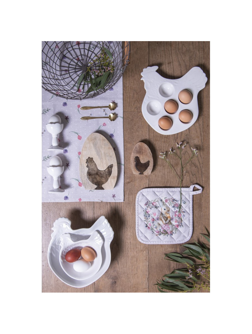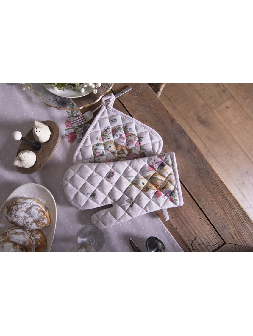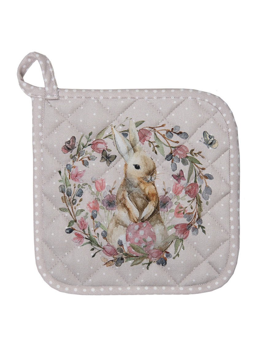 Bavlněná podložka nebo chňapka z textilní kolekce HAPPY BUNNY. Ústředním motivem této textilní řady je velmi detailně propracovaný zajíček, který je doplněn krásnými jarními květinami v nádherných jemných barvách.