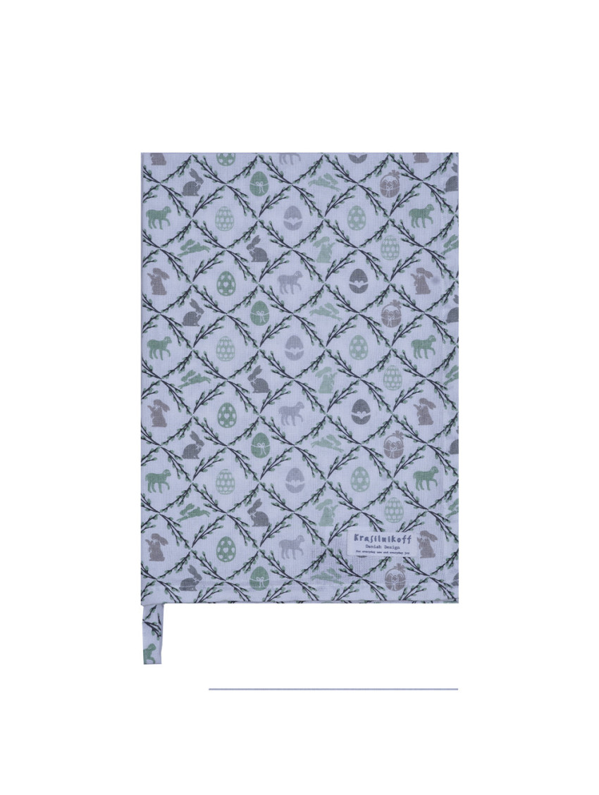 Bavlněná utěrka dánské značky Krasilnikoff v bílé barvě s velikonočními motivy do šedé a zelené nemusí být použita jen na utírání nádobí (přestože je díky 100% bavlně krásně savá), ale dobře poslouží i jako malý středový ubrus či ubrousek na pečivo a chléb. Díky poutku zavěsíte a stane se ozdobou každého kuchyňského koutu.