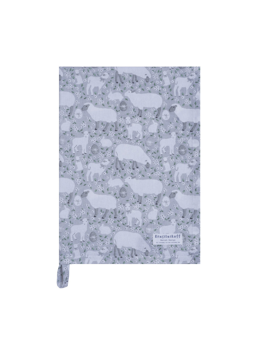 Bavlněná utěrka dánské značky Krasilnikoff v šedé barvě s jarními motivy oveček a zajíčků nemusí být použita jen na utírání nádobí (přestože je díky 100% bavlně krásně savá), ale dobře poslouží i jako malý středový ubrus či ubrousek na pečivo a chléb. Díky poutku zavěsíte a stane se ozdobou každého kuchyňského koutu.
