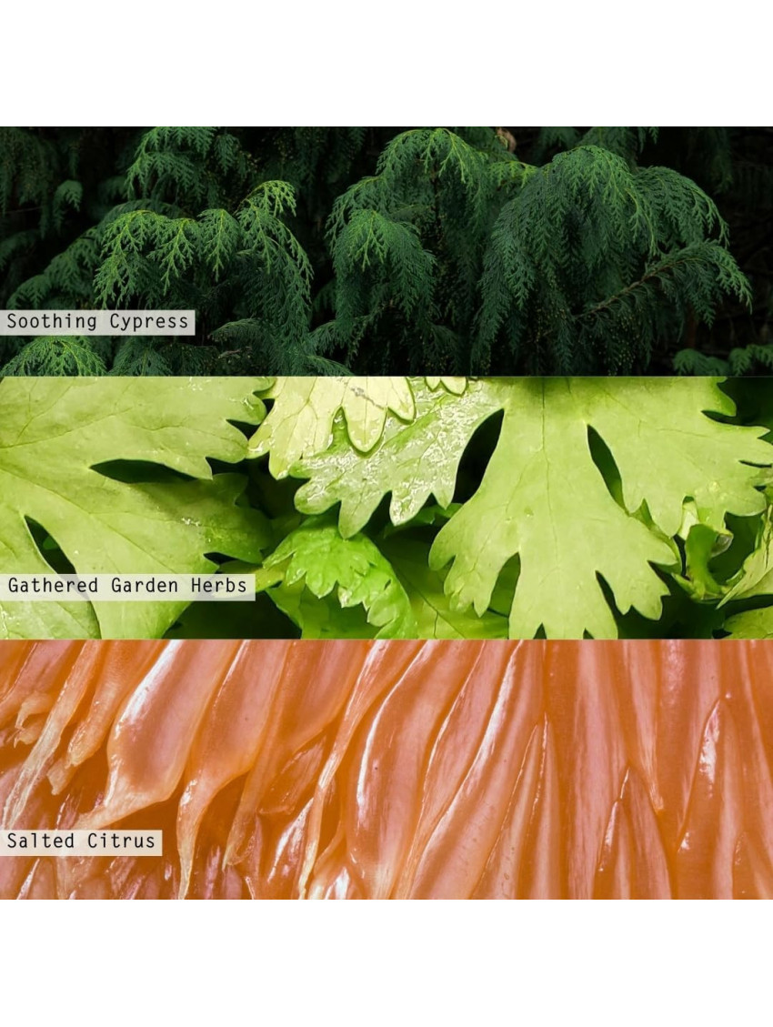 HINOKI SAGE: S tóny uklidňujícího cypřiše, se srdcem z nasbíraných zahradních bylin a s vůní sladkých citrusů.