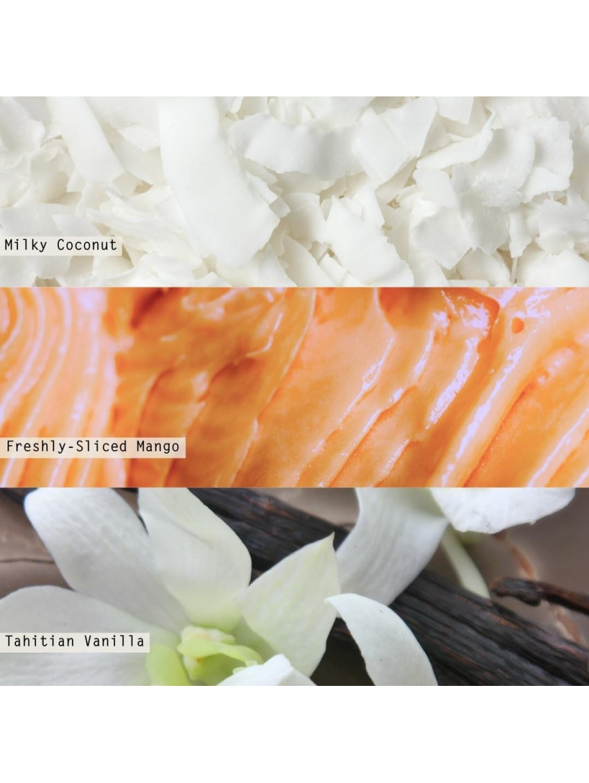 COCONUT MILK MANGO: Mléčný kokos s vydatnou chutí čerstvě nakrájeného manga políbený tahitskou vanilkou.