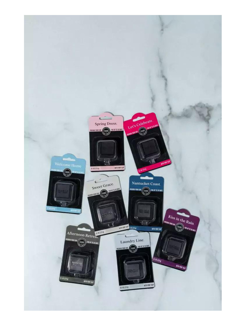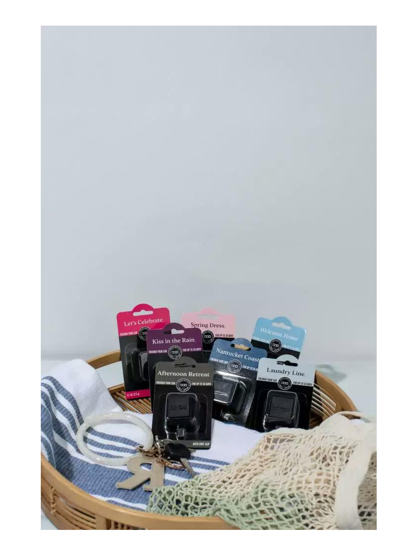 Vůně do auta z kolekce Laundry Line. Uvnitř krytu je zasunut nosič obsahující 100% vonný olej. Po připevnění pomocí klipu na výdech ventilace dochází k postupnému uvolňování vůně do interiéru vozu.
